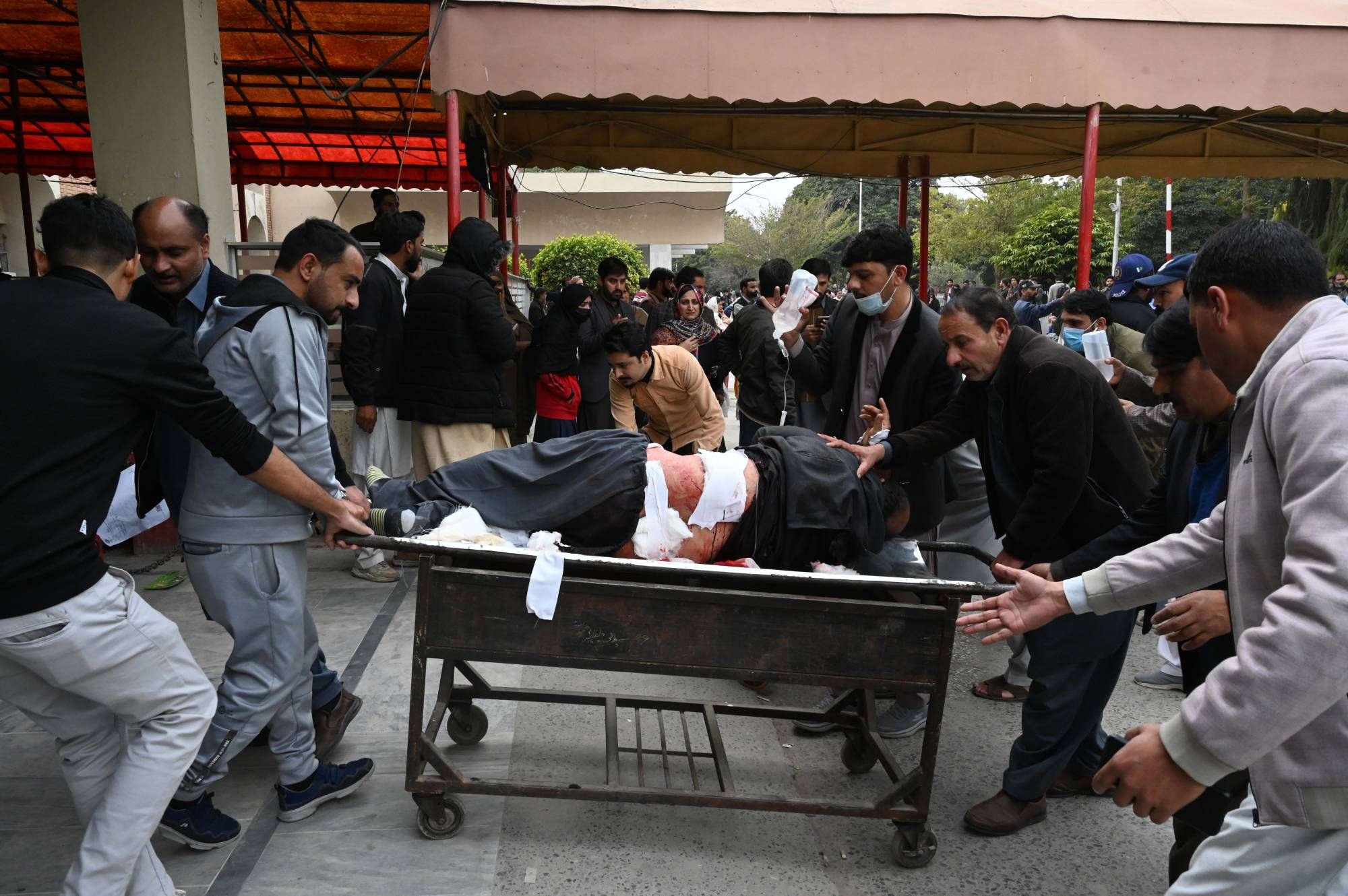 ورأى مراسلون عند مستشفى «المعهد الباكستاني للعلوم الطبية» عدداً من النساء والأطفال يُنقلون إلى المنشأة. وتولى مسعفون وأشخاص آخرون نقل الضحايا المضرجين بدمائهم من سيارات الإسعاف ومركبات أخرى. وعلت صرخات أصدقاء وأقارب الجرحى لدى وصولهم إلى قسم الطوارئ في المستشفى، حيث فرضت إجراءات أمنية مشددة.