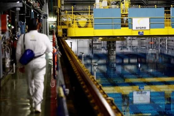 موظف يمشي بجوار الوقود النووي المستعمل في حوض تخزين بمحطة «أورانو» لإعادة معالجة النفايات النووية (رويترز)