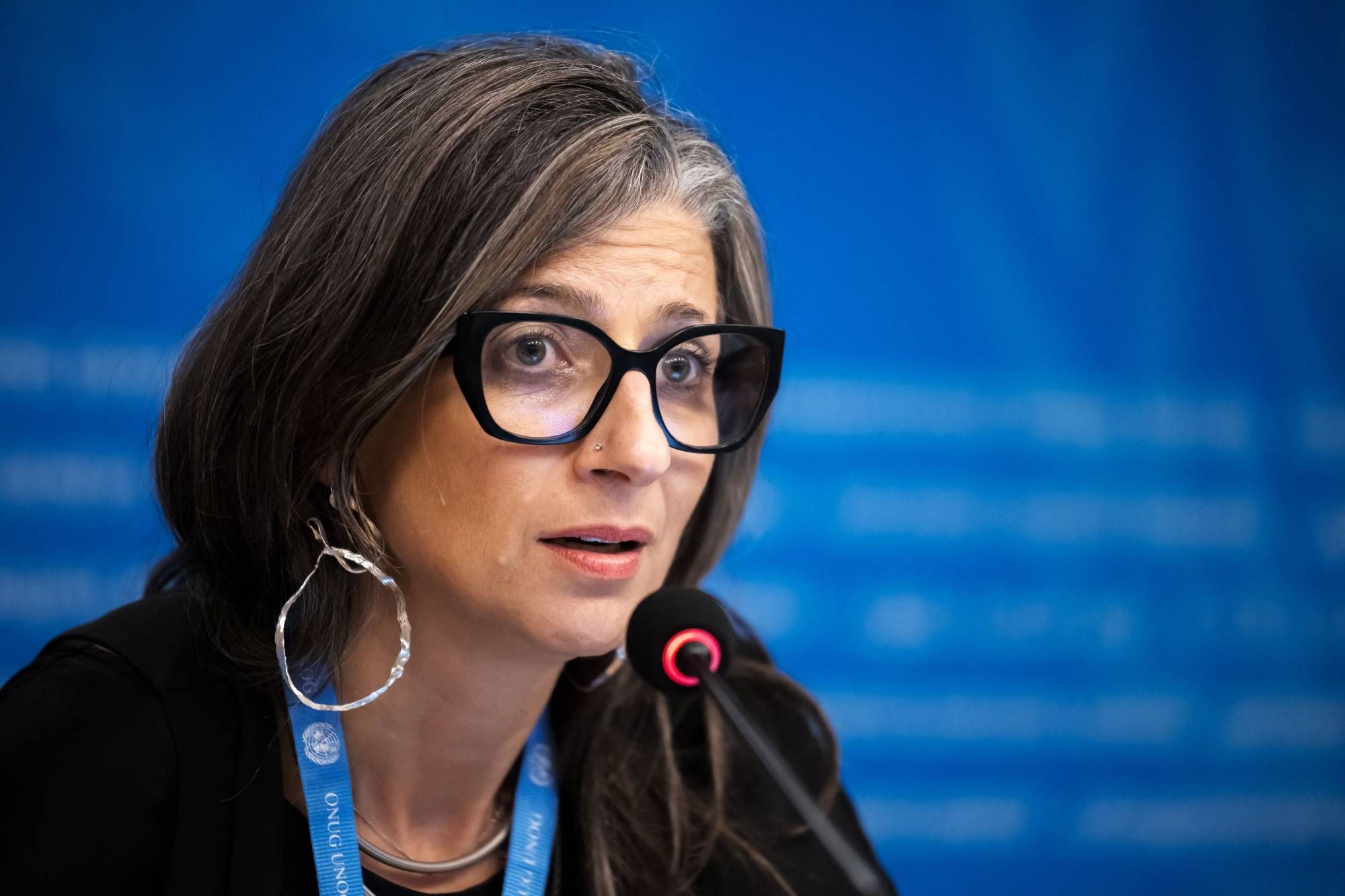 فرانشيسكا ألبانيزي مقررة الأمم المتحدة الخاصة المعنية بحالة حقوق الإنسان في الأراضي الفلسطينية المحتلة تتحدث في جنيف (رويترز)