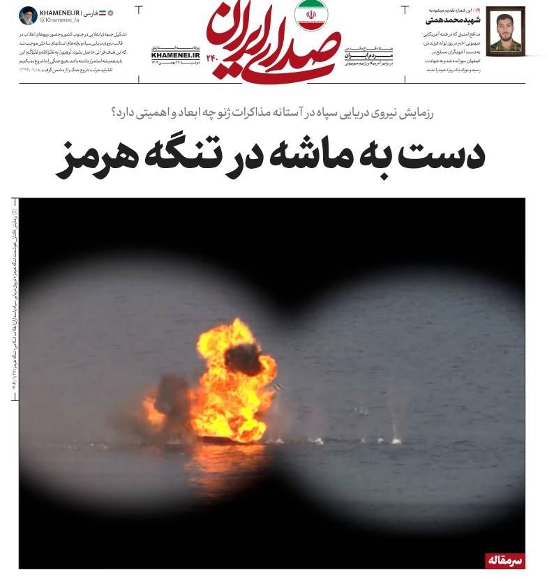 اليد على الزناد في مضيق هرمزووضعت «صوت إيران» الجريدة الرسمية لمكتب خامنئي، مناورات «السيطرة الذكية على مضيق هرمز» في سياق سردية أوسع عنوانها عرض «الوقائع كما هي» في ظل تصاعد الروايات المتضاربة.