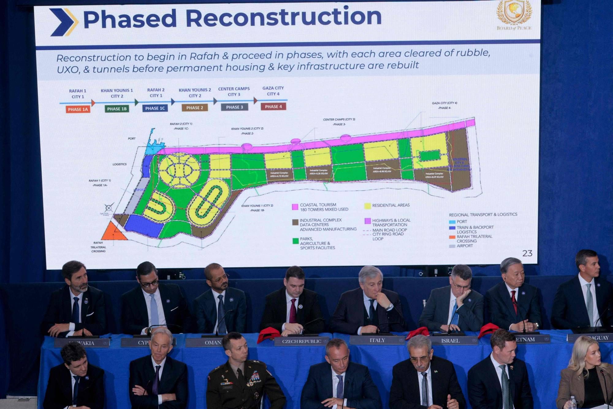 وأشار إلى أن الدول التي تشارك في الاجتماع لا تقتصر مساهمتها بالمال فقط، بل تعهد بعضها بإرسال أفراد للمساعدة في الحفاظ على وقف إطلاق النار، وضمان سلام دائم. وأكد أن الشرق الأوسط يشهد «سلاماً أكبر مما كان يُعتقد مستحيلاً لثلاثة آلاف عام»، بعد «تدمير القدرة النووية الإيرانية» عبر قاذفات B-2، عادّاً ذلك مفتاح السلام الإقليمي.