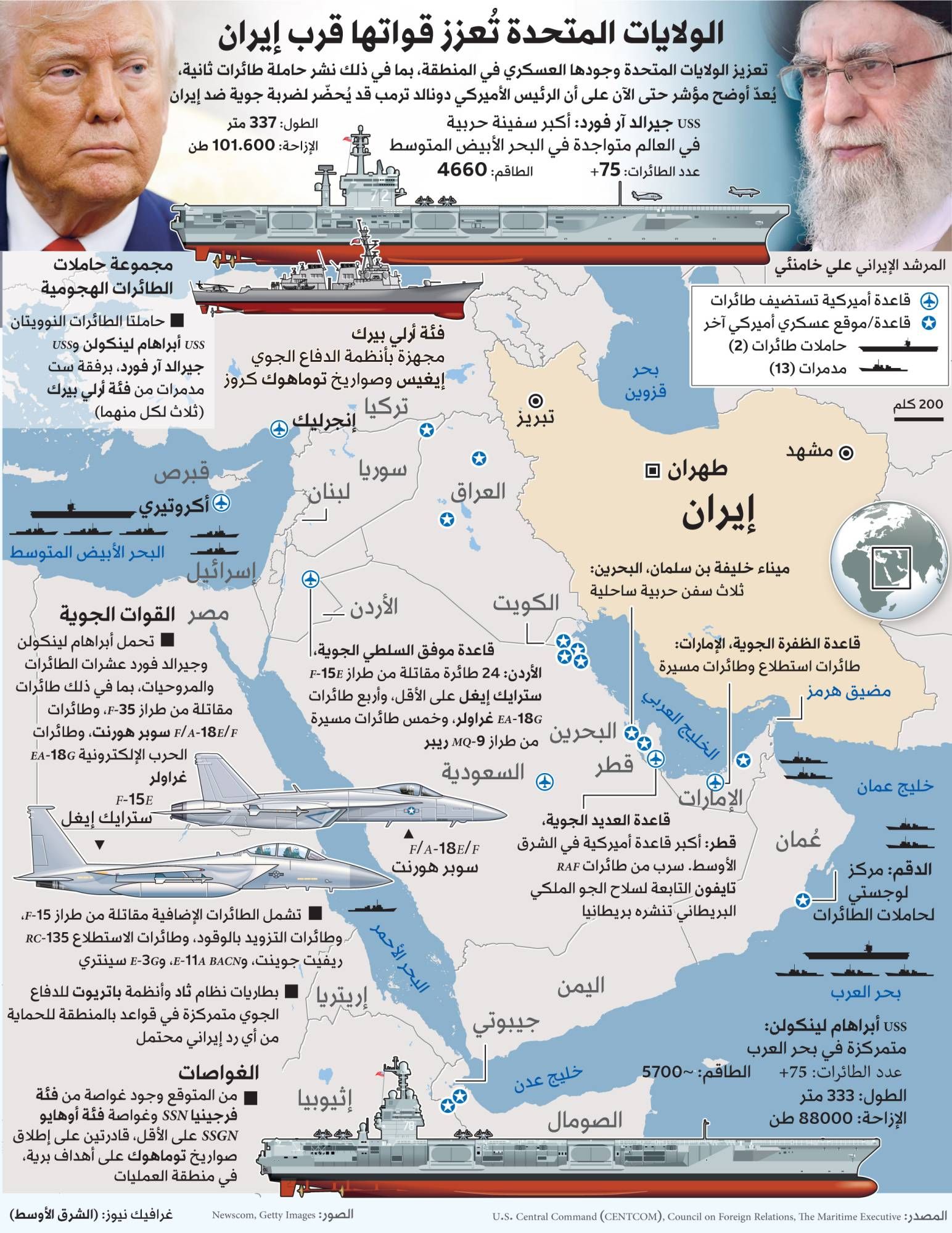 ونقلت صحيفة «الغارديان» عن خبراء عسكريين إن مجموعتي الحاملتين يمكن أن تنفذا «عدة مئات من الطلعات الهجومية يومياً لعدة أسابيع، بكثافة تفوق تلك التي شهدتها حرب الـ12 يوماً». وحتى من دون حاملة «فورد»، تستطيع الطائرات المنطلقة من «لينكولن» تنفيذ 125 مهمة قصف يومياً أو أكثر، ما يمنح الولايات المتحدة القدرة على بدء استهداف مواقع حكومية وعسكرية داخل إيران ضمن حملة جوية، إذا قرر ترمب المضي في الهجوم.