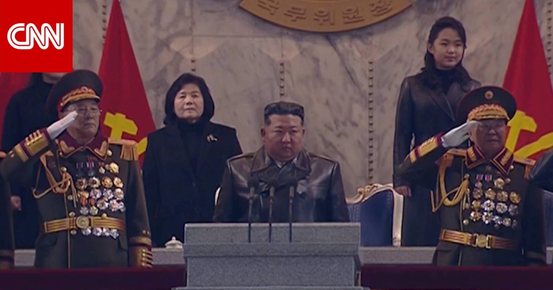 حيث لم تكن هناك صواريخ باليستية عابرة للقارات، أو مركبات صواريخ انزلاقية، أو شاحنات إطلاق صواريخ متنقلة عملاقة تمر أمام الكاميرات. فقط شوهد الزعيم الكوري الشمالي كيم جونغ أون برفقة ابنته، التي يُعتقد أنها كيم جو أي، وكلاهما يرتديان ملابس جلدية سوداء متطابقة.