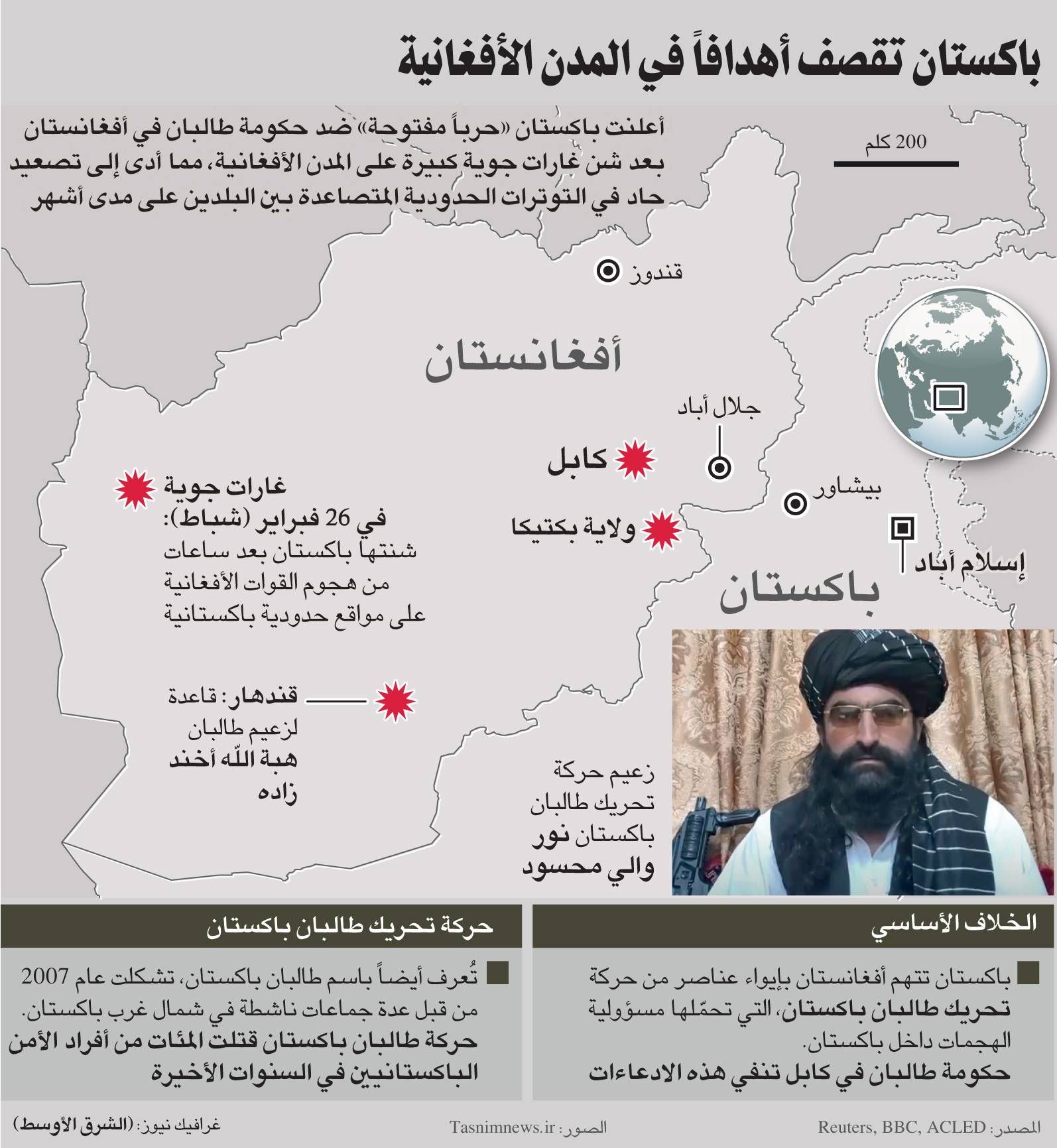 شنّ الجيش الباكستاني ضربات جوية جديدة استهدفت مزيداً من المنشآت العسكرية في عمق الأراضي الأفغانية ليلاً وحتى ساعات الصباح الأولى من يوم السبت، بعدما أعلنت باكستان أنها دخلت في «حرب مفتوحة» مع جارتها. وقالت باكستان إن هجومها، المستمر منذ الجمعة، جاء رداً على هجمات عبر الحدود، فيما اشتكت كابل من انتهاك سيادتها، وأكّدت أنها ما زالت منفتحة على الحوار، محذّرة في الوقت ذاته من عواقب اتّساع نطاق النزاع.