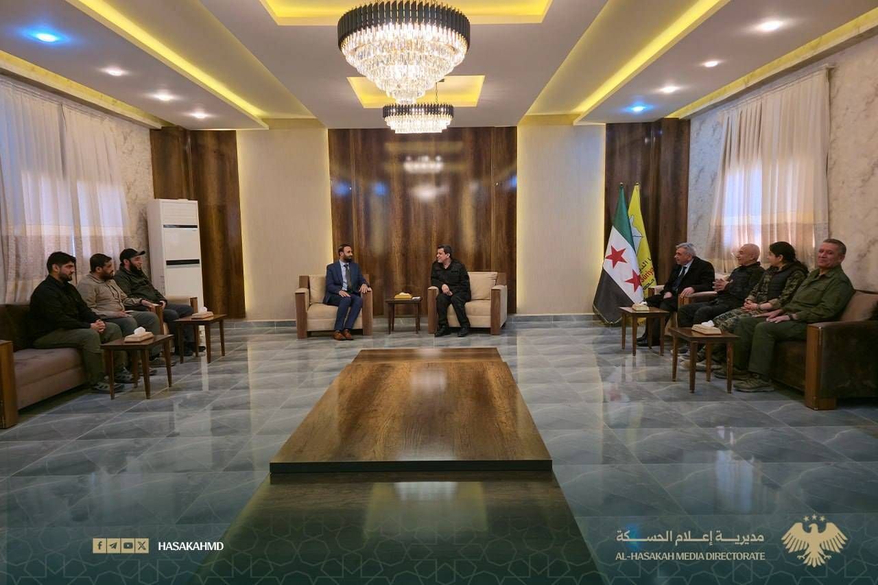 بحث مبعوث رئاسة الجمهورية، العميد زياد العايش، مع قائد «قسد» مظلوم عبدي، بحضور محافظ الحسكة نور الدين أحمد، وعدد من القادة العسكريين والأمنيين، آلية دمج المؤسسات العسكرية والأمنية، وناقش معهم الخطوات التنفيذية المتعلقة بذلك وفق اتفاق 29 يناير (كانون الثاني).