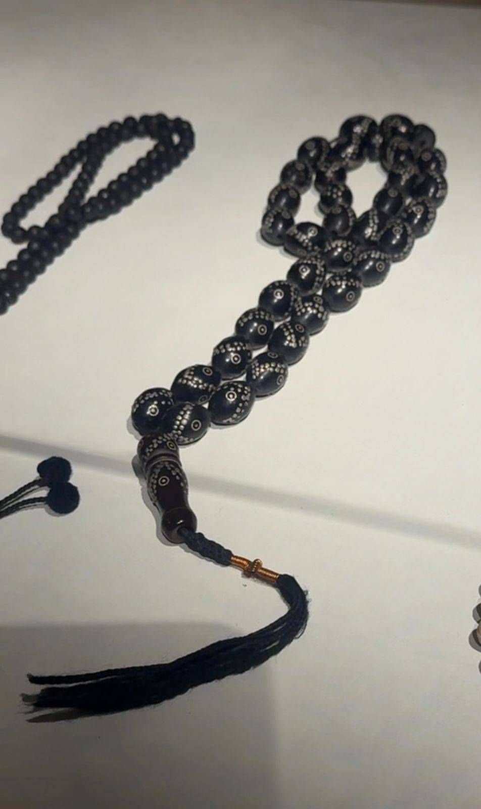 وبين هذه القطع، تبرز سبحة مصنوعة من اليسر المكاوي — وهو نوع نادر من المرجان الأسود الموجود في البحر الأحمر — مطعّمة بالفضة، وتعدّ من أجمل وأغلى المسابح التقليدية.