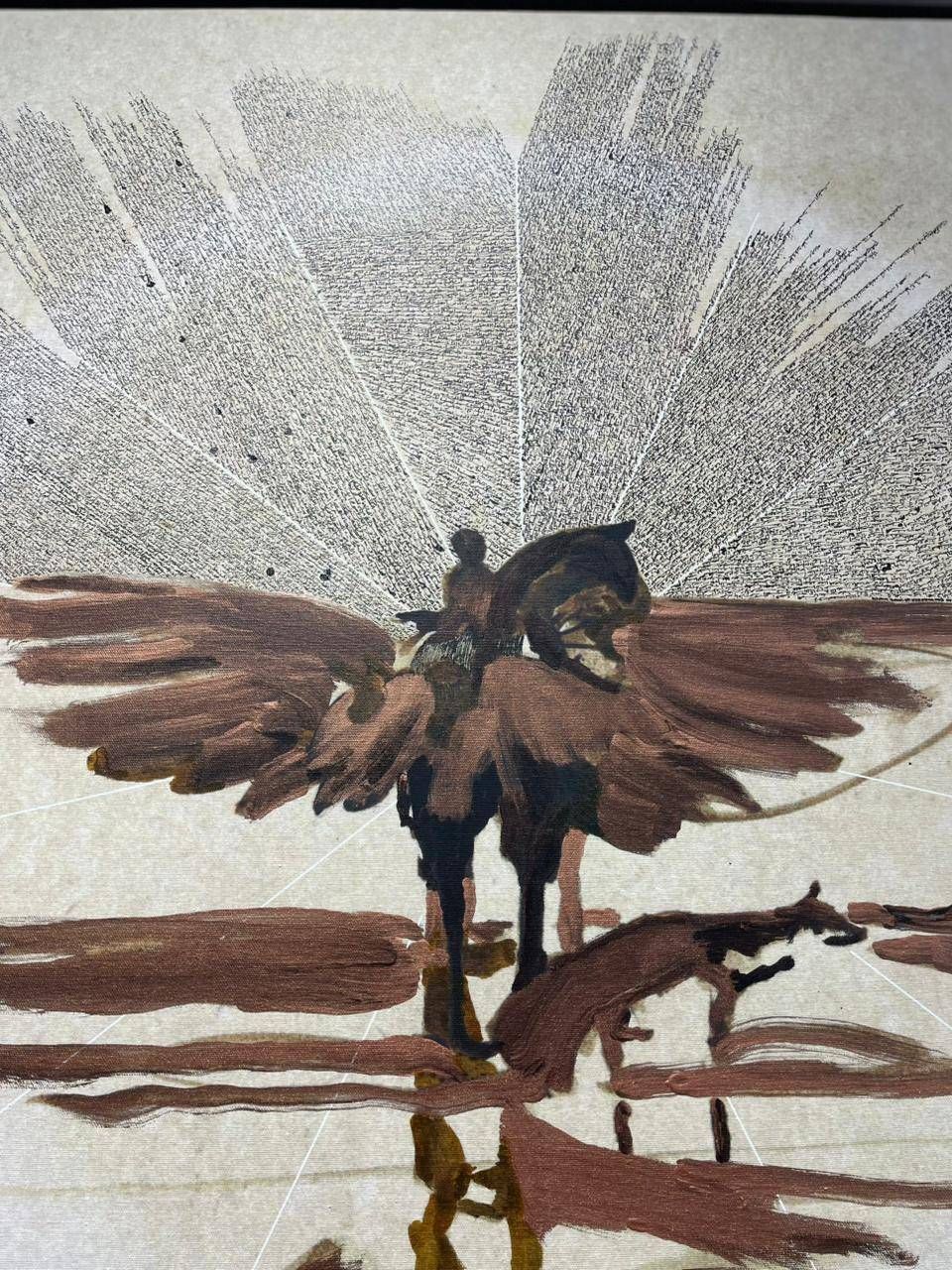 كما تظهر في عمل آخر صورة طائر ضخم يحمل راكباً، في حين تنفتح خلفهما مساحة من الكتابة تتّخذ شكل أشعة أو خطوط متفرِّعة. النصّ يملأ الخلفية مثل فضاء واسع تتحرَّك داخله الشخصية، فتبدو الكلمات كأنها مجال بصري يحتضن الحركة ويمنحها عمقاً درامياً.