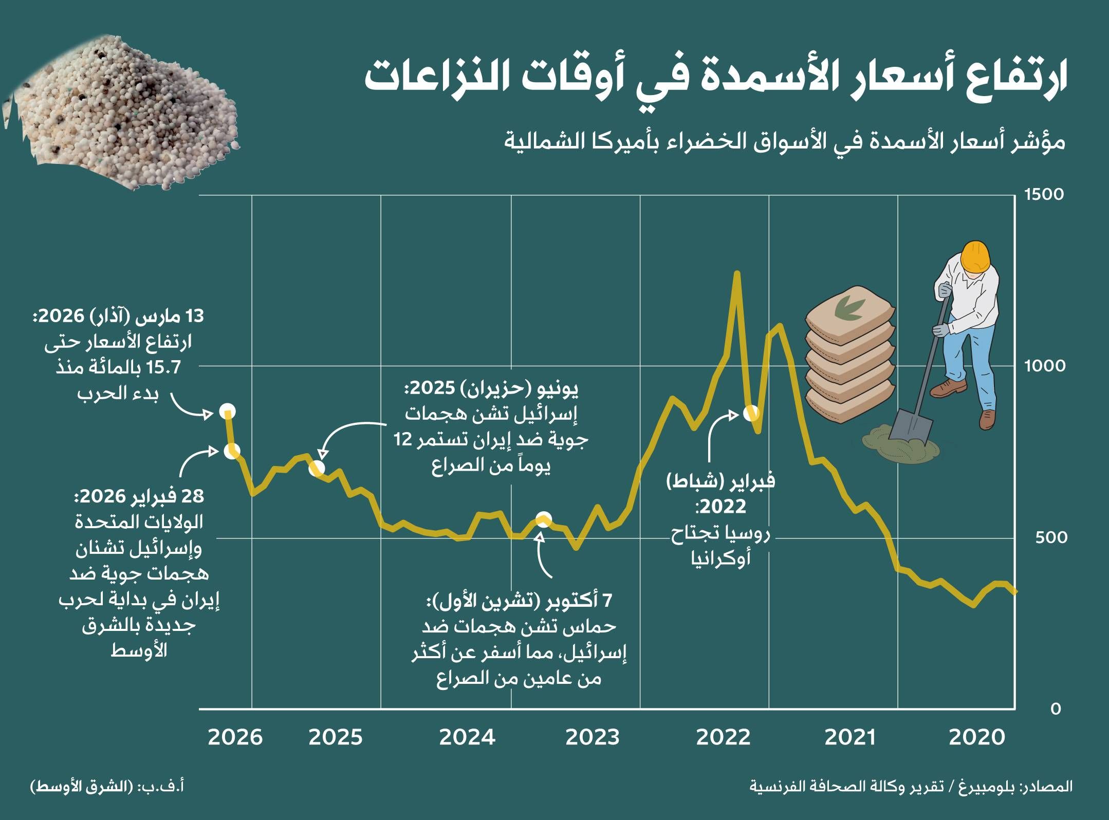 قفزة الأسعارانعكس هذا النزاع فوراً على جيوب المزارعين والمستهلكين؛ فقد قفزت أسعار تصدير اليوريا في الشرق الأوسط بنسبة 40 في المائة لتتجاوز 700 دولار للطن المتري بحلول 13 مارس (آذار). وفي الولايات المتحدة، سجلت الأسعار زيادة بنسبة 32 في المائة. ويحذر المحللون من أن استمرار الحرب قد يؤدي إلى «مضاعفة» أسعار الأسمدة النيتروجينية، في ظل غياب أي منتج قادر على تعويض النقص بسرعة، خاصة مع انشغال روسيا بتحدياتها الميدانية واستمرار القيود الصينية.