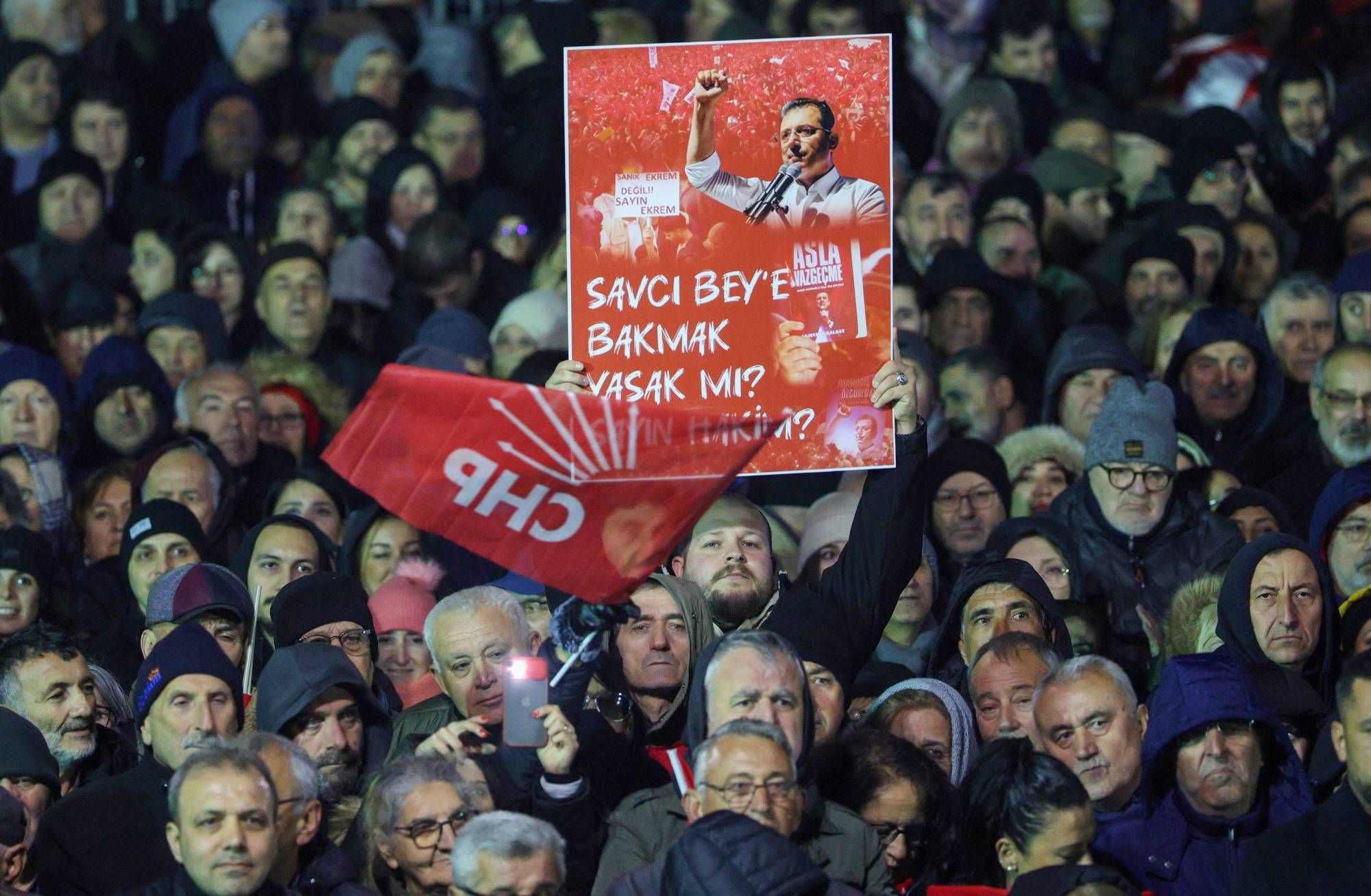 وخلال التجمع الحاشد ردد الآلاف شعارات مثل «الرئيس إمام أوغلو» و«استقل يا طيب (إردوغان)» و«إما نكون جميعاً أو لا أحد» و«كل شيء سيكون على ما يرام»، ملوحين بالأعلام واللافتات التي تحمل صور إمام أوغلو، الذي رشحه حزب «الشعب الجمهوري» لخوض انتخابات الرئاسة المقبلة، وشعارات تطالب بإطلاق سراحه.