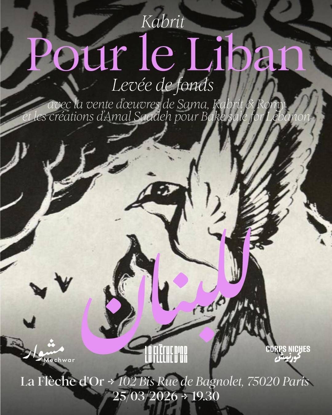 يُقام حفل «للبنان» في 25 مارس (آذار) على مسرح «فليش دور» في باريس، ويحييه عدد من الموسيقيين والمغنّين اللبنانيين المقيمين في فرنسا، من بينهم بشار مار خليفة، وزيد حمدان، والسورية لين أديب، إضافة إلى الأختين كسرواني. وقد نفدت بطاقات الحفل خلال 3 أيام فقط من الإعلان عنه.