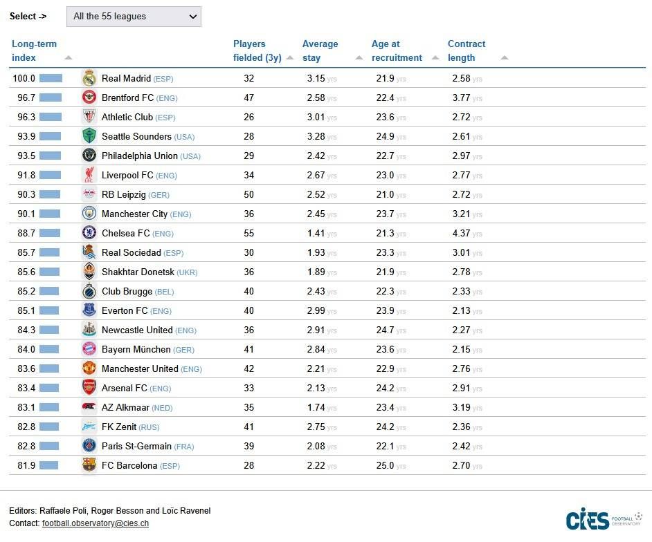على مستوى العالم، تصدر ريال مدريد القائمة بالعلامة الكاملة؛ إذ سجل 100.0 نقطة، بعدما استخدم 32 لاعباً فقط خلال آخر 3 سنوات، وبلغ متوسط بقاء لاعبيه الحاليين 3.15 سنة، فيما وصل متوسط أعمار التعاقد إلى 21.9 سنة، ومتوسط المتبقي من عقودهم إلى 2.58 سنة. هذا المزيج يوضح أن النادي الإسباني لا يبدل كثيراً، ويتعاقد في سن صغيرة نسبياً، ثم يحتفظ بالعناصر مدة تسمح ببناء مشروع مستقر.