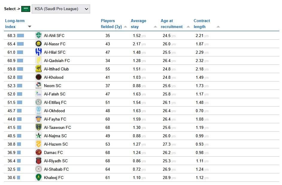 ومن زاوية أخرى، يكشف الجدول السعودي عن أن أفضلية الأهلي جاءت من أنه جمع توازناً مقبولاً في كل العناصر من دون أن يتفوق بشكل ساحق في عنصر واحد. فهو ليس الأعلى في متوسط البقاء، وليس الأقل في سن التعاقد، وليس الأطول في العقود، لكنه كان الأعلى توازناً إجمالاً. النصر تفوق عليه في متوسط البقاء، والقادسية تفوق عليه في قلة عدد اللاعبين المستخدمين، والهلال والاتحاد كان متوسط المتبقي من العقود قريباً، لكن الأهلي خرج بأفضل حصيلة كلية.