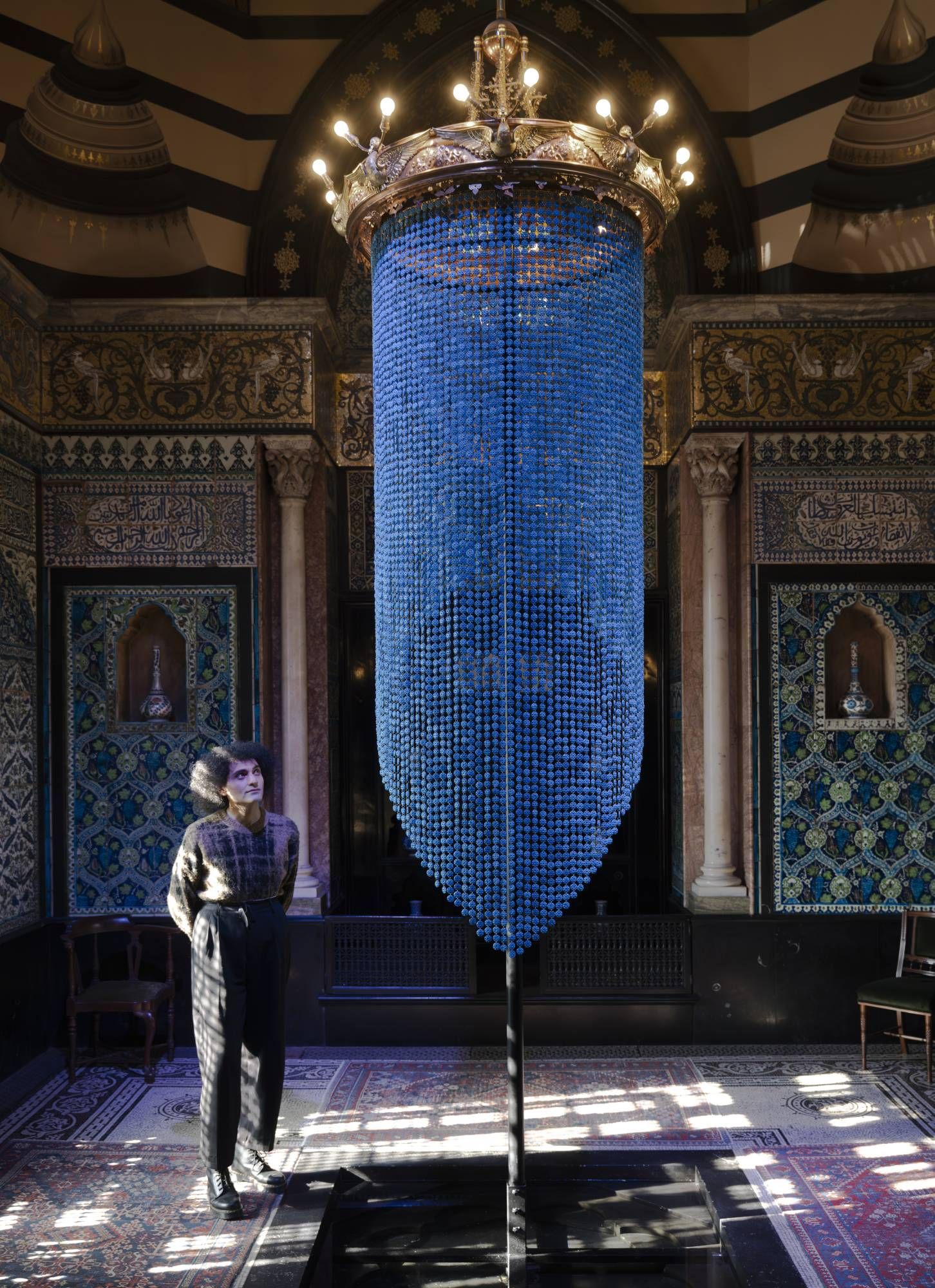 في هذه القاعة تحديداً، التي جلب لها اللورد ليتون السيراميك واللوحات من أنحاء المشرق، يطل علينا عمل معاصر للفنان اللبناني رمزي ملاط، لا يبدو دخيلاً على الجو العام للقاعة بل يمتزج معها إلى درجة كبيرة، فهنا تتدلى أمامنا من الثريا المعدنية سلاسل من حبات الخرز الأزرق، نقترب منها وتأخذنا بشكلها الأسطواني وتكوينها الذي يشبه المشربيات الشرقية. تتدلى خيوطها وحبات الخرز فيها لتتفاعل مع الجدران الزرقاء حولها وتعكس ظلالها على بركة الماء أسفلها.
