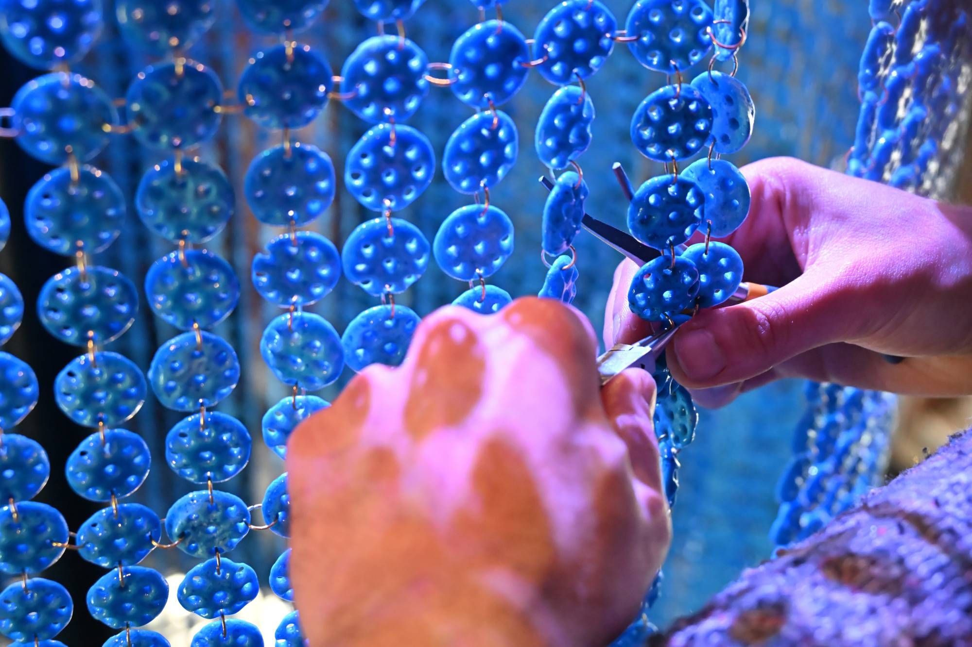 بالاقتراب من العمل نتبين تفاصيل الخرزات الزرقاء وتناغمها، هي مثل تلك التي تستخدم لدرء النظرة الحاسدة في الثقافات العربية، ربما هذا ما يعكسه عنوان العمل وهو «أطلس النظرة المتشابكة». النظرة هنا أساسية لفهم العمل، فالخرز الأزرق كان يستخدم للحماية من الحسد ومن النظرة الشريرة، ولكن العمل يوظف ذلك العنصر للحديث عن مواضيع أعمق تنبع من خلال تلك المظلة المؤلفة من آلاف «العيون» الخزفية الزرقاء، حيث نسج الفنان عملاً يستمد من الفلكلور الشامي وتقاليد الحرف الإسلامية واللغة المعمارية والرمزية للمكان، ليقدم تأملاً معاصراً في الإدراك والحماية والتراث الثقافي.