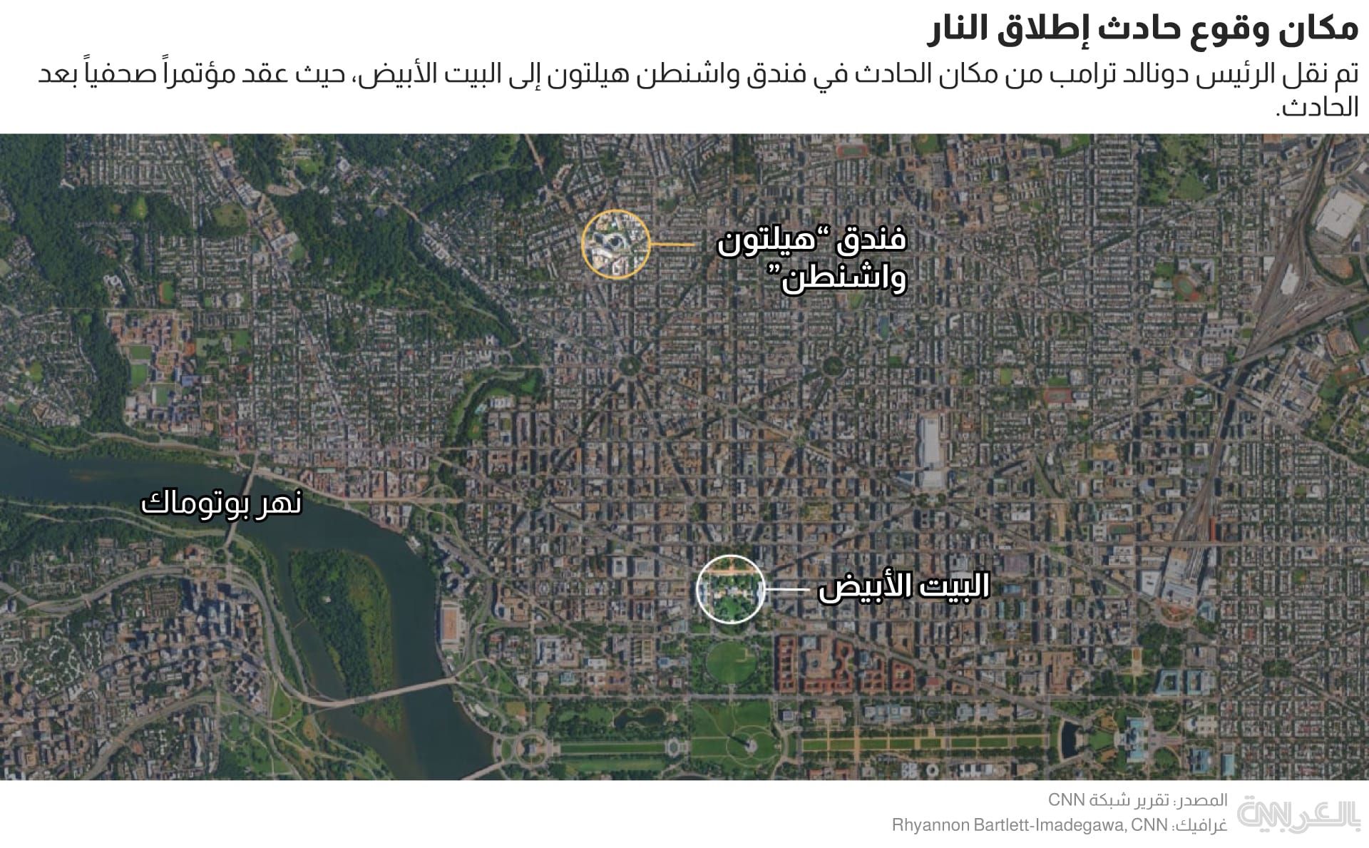 وتمّ إجلاء الرئيس الأمريكي دونالد ترامب، ونائبه جيه دي فانس، والسيدة الأولى ميلانيا ترامب، والعديد من أعضاء الحكومة إلى مكان آمن، بعد سماع دويّ إطلاق نار خارج قاعة الاحتفالات في هذا الفندق الشهير في واشنطن العاصمة.