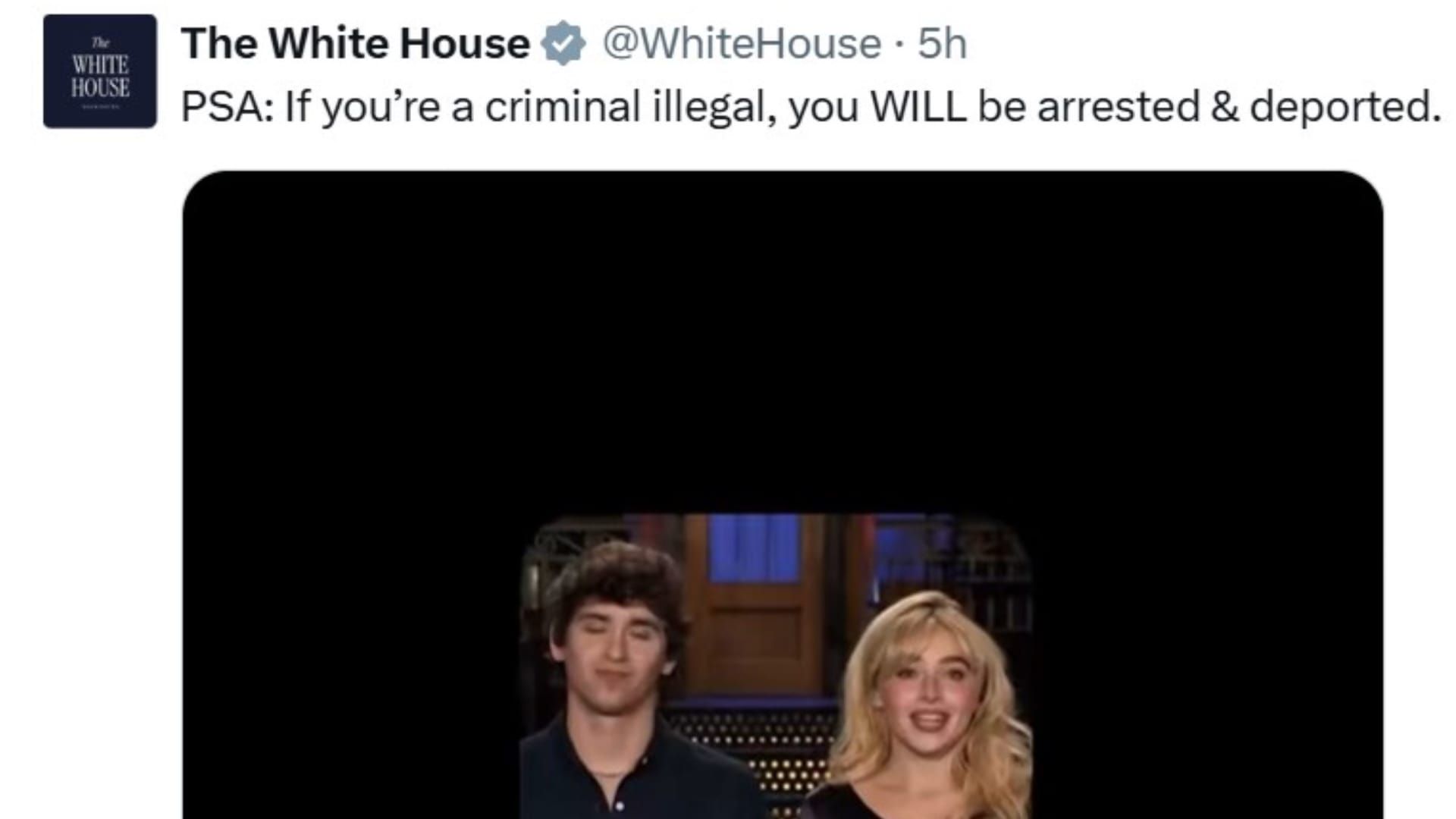 ونشر البيت الأبيض مقطع فيديو جديدًا على "إكس" يعرض مقطعًا لكاربنتر في برنامج "ساترداي نايت لايف"، حيث تقول: "أعتقد أنني قد أحتاج إلى اعتقال شخص ما لكونه جذابًا للغاية". لكن صوتًا آليًا يقول الآن "غير قانوني" بدلاً من "جذاب"، ويستمر الفيديو بتصوير عناصر إنفاذ القانون وهم يعتقلون أفرادًا.