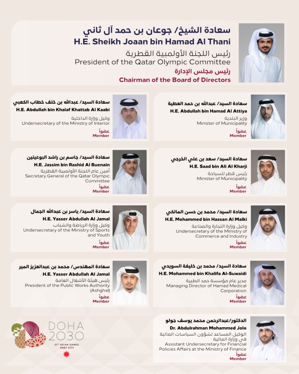 الأحد 7 ديسمبر 2025 05:40 مساءً أُعلن أمس عن تشكيل مجلس إدارة اللجنة المنظمة لدورة الألعاب الآسيوية الحادية والعشرين - الدوحة 2030، برئاسة سعادة الشيخ جوعان بن حمد آل ثاني، رئيس اللجنة الأولمبية القطرية، وعضوية كل من سعادة السيد عبدالله بن حمد العطية، وزير البلدية، وسعادة السيد عبدالله بن خلف خطاب الكعبي، وكيل وزارة الداخلية، وسعادة السيد سعد بن علي الخرجي، رئيس قطر للسياحة.