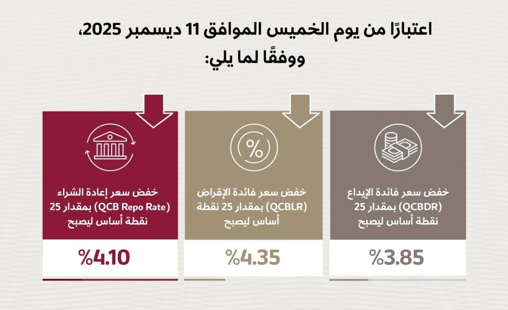 كما خفض سعر إعادة الشراء «QCB Repo Rate» بمقدار 25 نقطة أساس ليصبح 4.10 بالمائة على أن يسري التخفيض اعتباراً من اليوم الخميس.