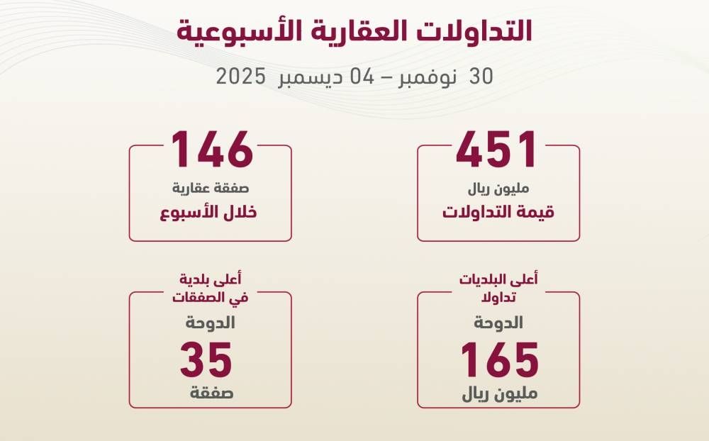 وفصلياً ارتفعت قيمة التداولات العقارية في دولة قطــــر خــلال الربع الثالث من عام 2025 بنسبة 34 % على أساس سنوي، كما زاد عدد الصفقات 57.4 % على أساس سنوي.
