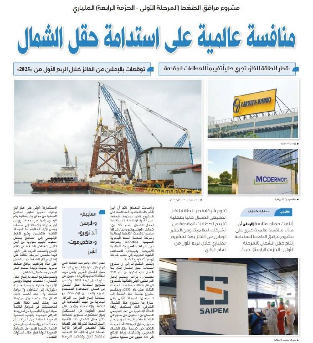 الاثنين 22 ديسمبر 2025 05:28 مساءً تأكيداً لانفراد الوطن في فبراير 2025 أعلنت شركة سايبم للخدمات النفطية الإيطالية فوز تحالفها مع شركة هندسة النفط البحرية الصينية (COOEC) بعقد للهندسة والتوريد والبناء والتركيب البحري لمشروع مرافق الضغط البحرية ضمن مشروع استدامة حقل الشمال من شركة قطر للطاقة للغاز الطبيعي المسال. وذكرت الشركة في بيان أن القيمة الإجمالية للعقد تبلغ نحو 4 مليارات دولار وتصل حصة سايبم إلى نحو 3.1 مليار دولار و900 مليون دولار لشركة هندسة النفط البحرية الصينية (COOEC) على أن تمتد مدة تنفيذ المشروع لنحو خمسة أعوام.