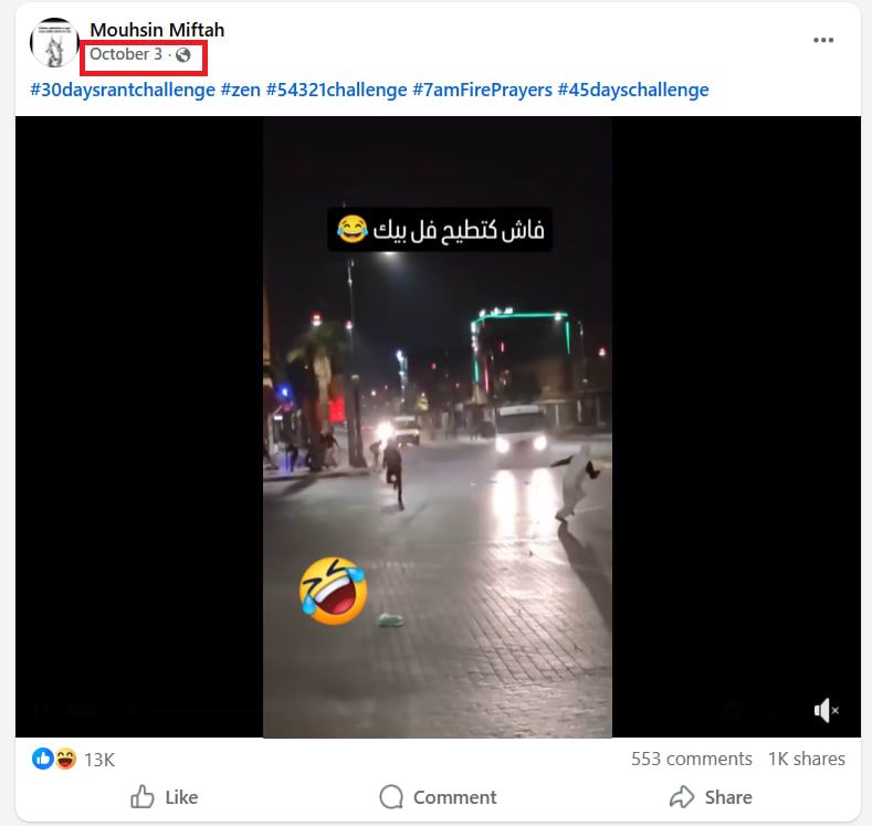 وظهر الفيديو للتداول في 3 أكتوبر/تشرين الأول 2025، بحسب منشور عبر فيسبوك تضمن وسوم جرى استخدامها إبان الاحتجاجات، مثل: #30daysrantchallenge #zen #54321challenge #7amFirePrayers #45dayschallenge".