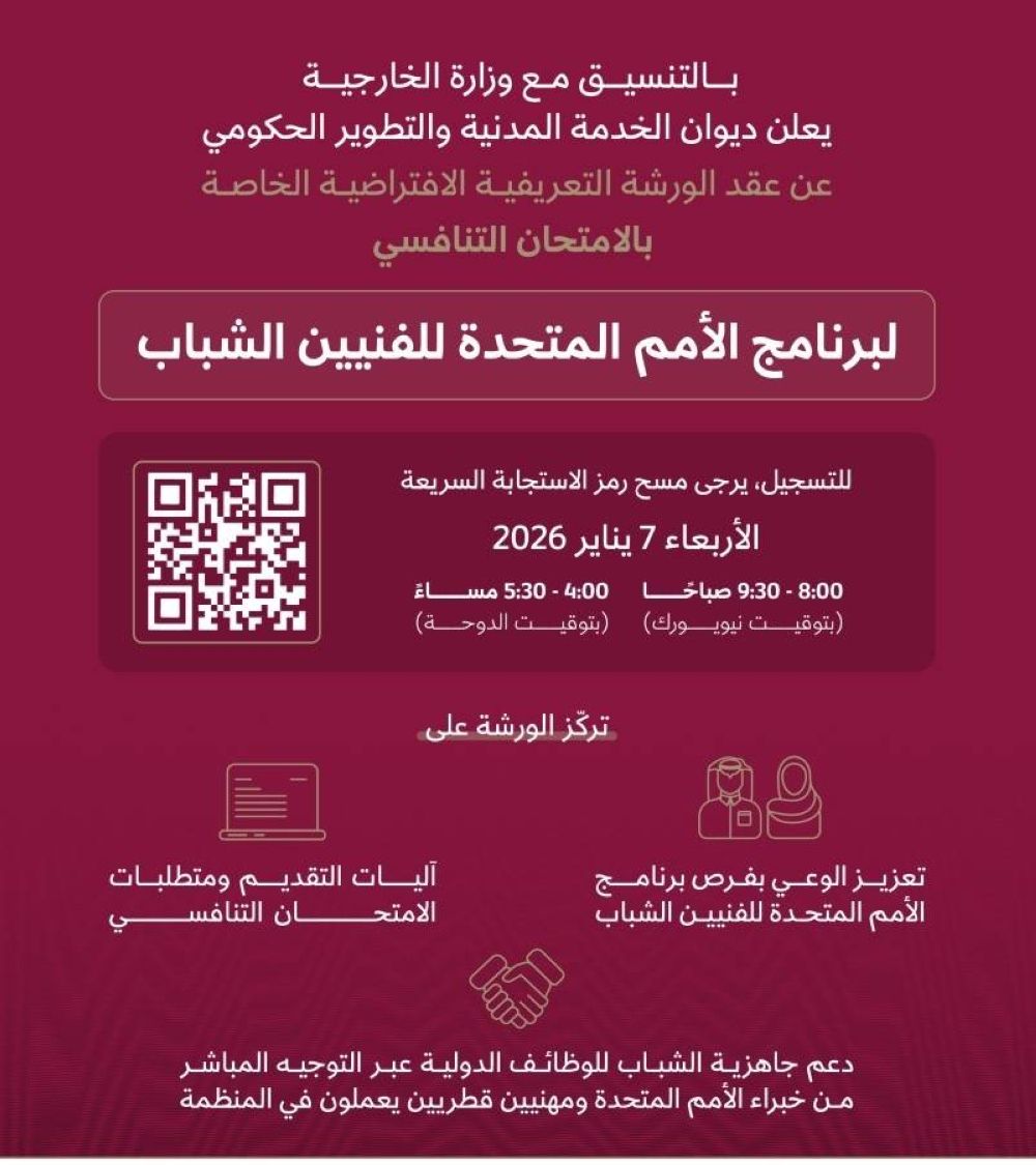 الأحد 4 يناير 2026 05:16 مساءً دعا ديوان الخدمة المدنية والتطوير الحكومي بالتنسيق مع وزارة الخارجية إلى حضور الورشة الافتراضية التعريفية الخاصة بالامتحان التنافسي لبرنامج الأمم المتحدة للفنيين الشباب، والموجّهة إلى طلبة الجامعات والكليات في دولة قطر، وموظفي الجهات الحكومية ممّن تنطبق عليهم متطلبات البرنامج، والباحثين عن فرص مهنية دولية، بالإضافة إلى المهتمين في المجال الدبلوماسي، وأفراد المجتمع المدني، والمنظمات غير الحكومية والقطاع الخاص، والمشاركين في برامج تطوير الموارد البشرية الوطنية الذين يطمحون للعمل في المنظمات الدولية.