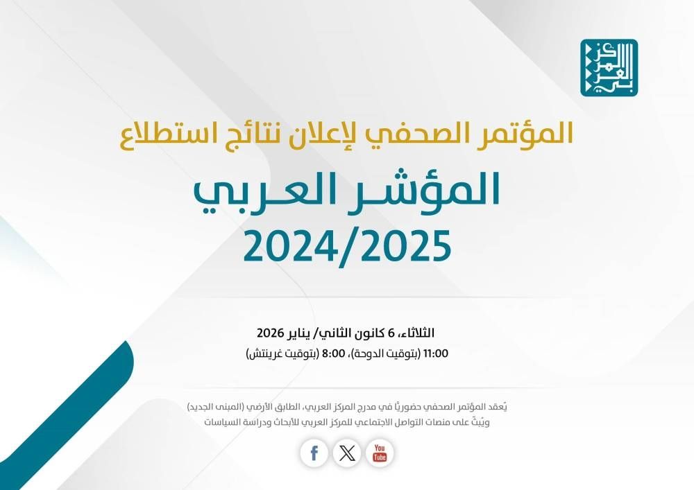 الأحد 4 يناير 2026 05:16 مساءً يعلن المركز العربي للأبحاث ودراسة السياسات في مؤتمر صحفي، يعقده في مقره في الدوحة، النتائج الرئيسة لـ «المؤشّر العربي» في دورته التاسعة لعام 2025، وذلك يوم غدٍ الثلاثاء 6 يناير 2026، في الساعة الحادية عشرة صباحا بتوقيت الدوحة.