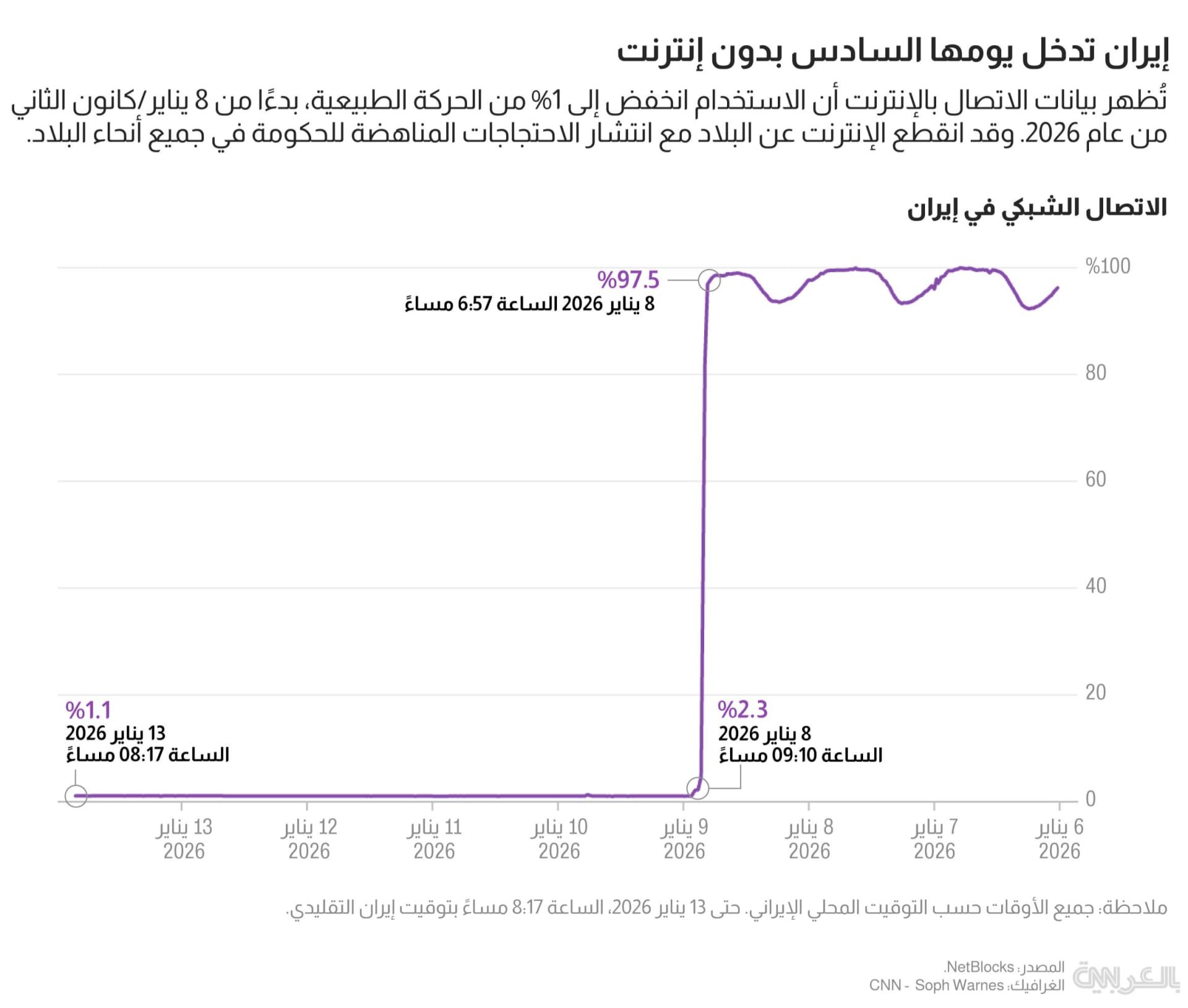 لعدة أيام، قطعت الحكومة الإيرانية خدمة الإنترنت عن سكانها، وأفادت التقارير بمقتل أكثر من 1800 متظاهر، فيما وصفه مراقبون بأنه أحد أكبر عمليات التعتيم الرقمي التي شنها النظام على الإطلاق. وتشير منظمات حقوق الإنسان إلى أن عدد القتلى قد يكون أعلى بكثير، نظراً لصعوبة حصر الضحايا بسبب انقطاع الاتصالات.