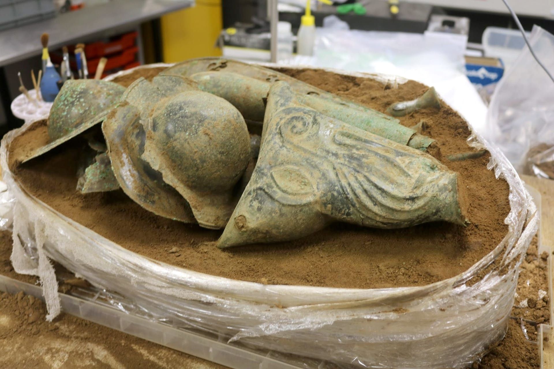قام الفريق برفع القطع بعناية من الموقع، إذ كانت مغلفة داخل كتلة من التربة.