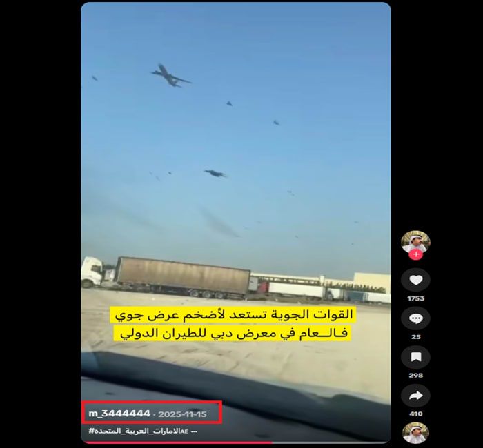 آنذاك، كتب أحد ناشي الفيديو، مُعلقًا: "القوات الجوية تستعد لأضخم عرض جوي في العام في معرض دبي للطيران الدولي".