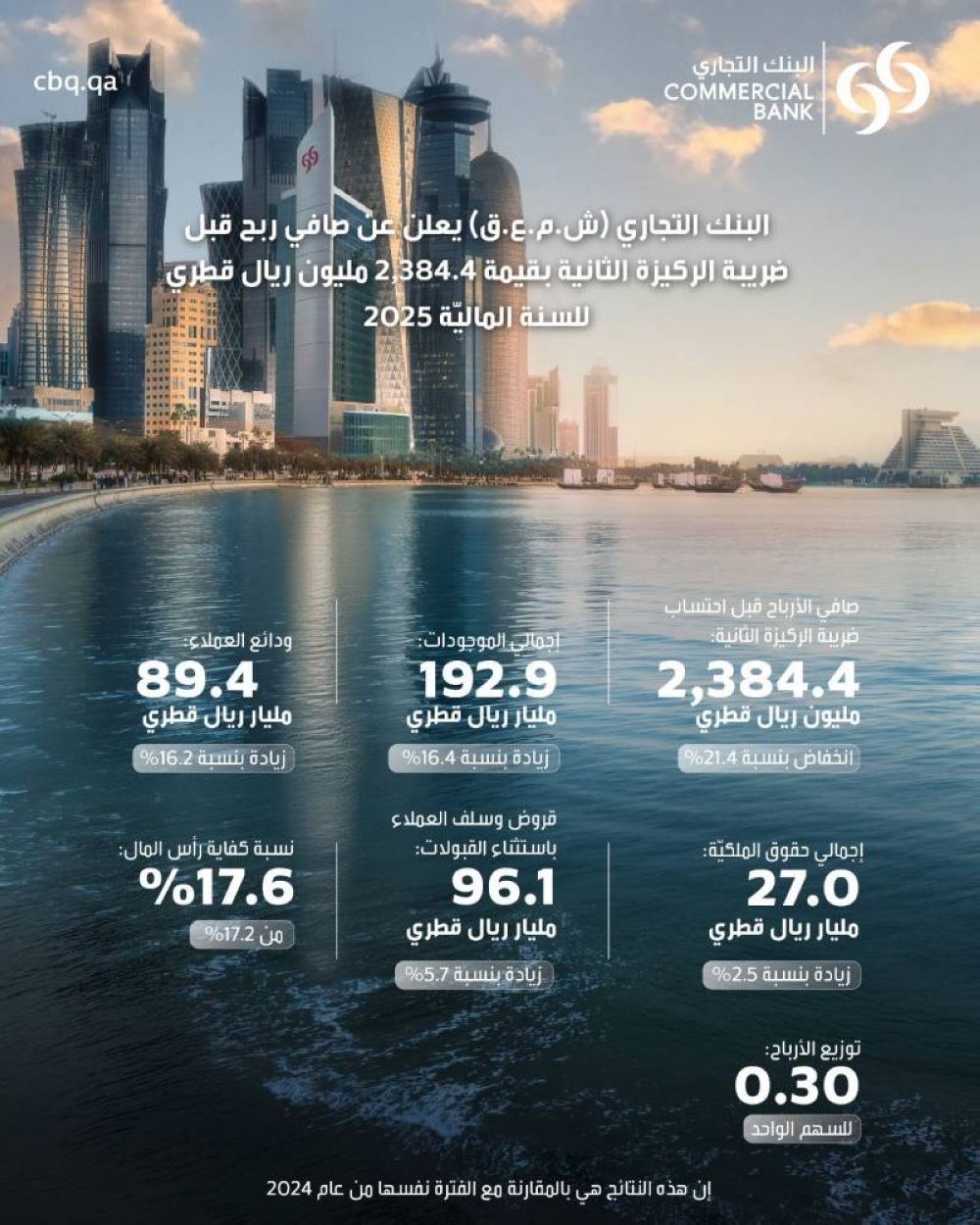 وقال سعادة الشيخ عبد الله بن علي بن جبر آل ثاني، رئيس مجلس الإدارة: «شهد عام 2025 تنفيذًا منضبطًا واستمرارًا في متانة الميزانية العمومية في قطاعي القروض والأوراق المالية الاستثمارية. وحقّقت المجموعة زخمًا إيجابيًا في نمو الدخل الأساسي والأصول، مدعومًا بحوكمة رشيدة وإطار قوي لإدارة المخاطر. ومن الجدير بالذكر أنّ وكالات التصنيف الائتماني الرئيسية الثلاث أكّدت قوّة التصنيف الائتماني للبنك التجاري، بما يعزّز مسارنا نحو تحقيق نمو آمن ومستدام وإرساء قيمة طويلة الأجل بما يتماشى مع رؤية قطر الوطنية 2030. ومع تعيين الرئيس التنفيذي الجديد للمجموعة، ستيفن موس، في النصف الثاني من عام 2025، أصبحت المجموعة في وضع قوي يسمح لها بالبناء على أسسها المتينة والمضي قدمًا نحو المرحلة التالية من استراتيجيتها».