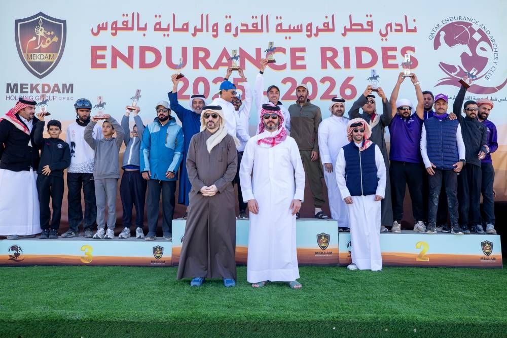 الثلاثاء 20 يناير 2026 06:04 مساءً توج سعادة الشيخ محمد بن نواف آل ثاني رئيس نادي سباقات القدرة والتحمل، الفائزين بسباق كأس الوذنة لمسافة 100 كيلو متر تأهيلي و120 كيلو مترا (تنافسي دولي) فئة نجمتين، والرماية من على ظهر الخيل، والذي نظمه النادي بالقرية الماراثونية بسيلين، وسط أجواء متميزة ومشاركة واسعة وصلت إلى 50 فارسا، وذلك في حضور السيد محمد بن ماجد السليطي نائب رئيس النادي الذي شارك في التتويج.
