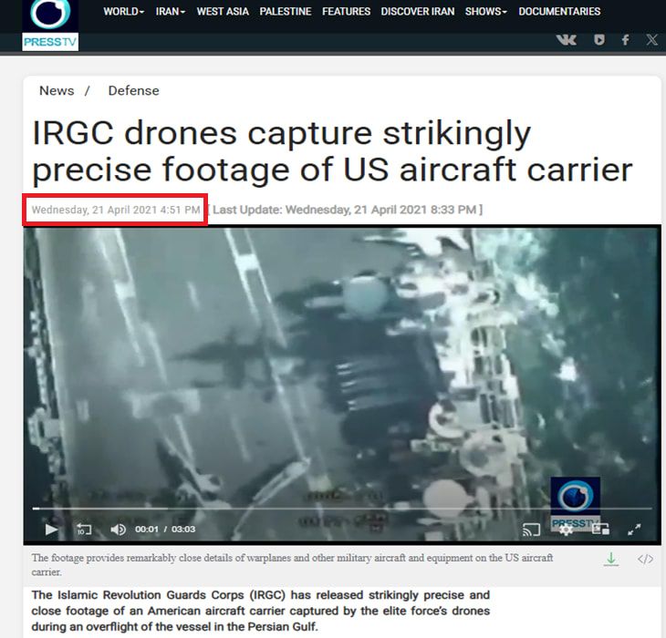 آنذاك، أفادت "برس تي في" أن "طائرات مسيرة تابعة للحرس الثوري الإيراني تلتقط صورًا دقيقة للغاية لحاملة الطائرات الأمريكية" في الخليج العربي.