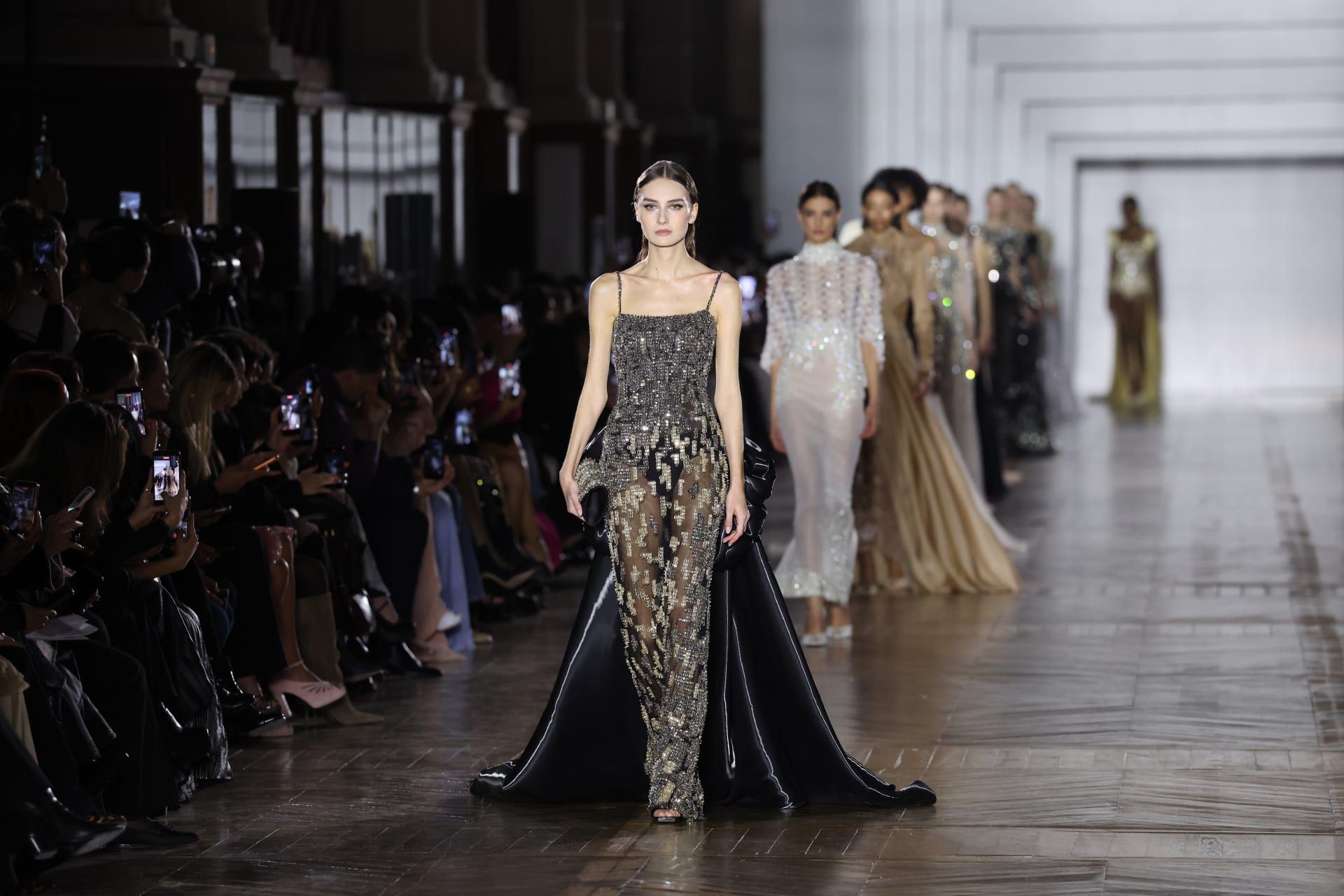 أما الألوان فقد ظهرت عبر انتقالات ناعمة مستوحاة من الضوء المتغيّر، حيث امتزجت الدرجات البلورية والباستيل، مع لمسات معدنية متلألئة، ما منح كل قطعة بُعدًا متجددًا مع الحركة والضوء على المنصّة.