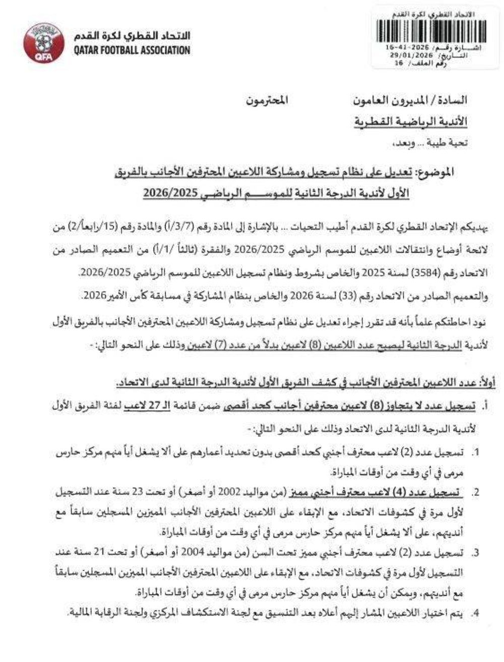 الخميس 29 يناير 2026 05:28 مساءً أصدر الاتحاد القطري لكرة القدم تعميمًا مفاجئًا يقضي بزيادة عدد اللاعبين المحترفين الأجانب في أندية الدرجة الثانية إلى 8 لاعبين بدلًا من 7، وذلك قبل أيام قليلة فقط من إغلاق باب الانتقالات الشتوية للموسم الرياضي 2025 - 2026، في خطوة أثارت حالة من الجدل والتساؤلات داخل الأوساط الفنية والإدارية.