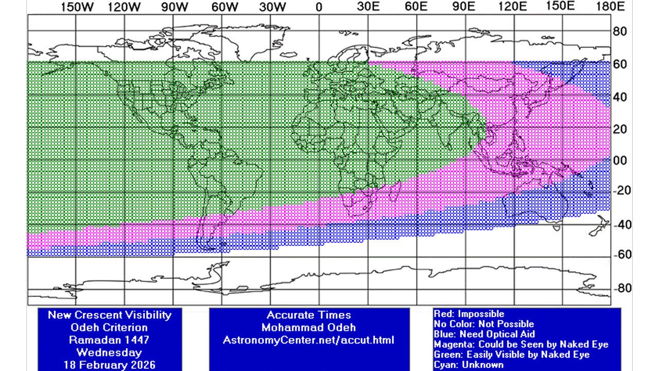 وذكر المركز في بيان: "ستتحرى معظم الدول هلال شهر رمضان يوم الثلاثاء 17 فبراير/شباط 2026م، فإن رؤية الهلال يوم الثلاثاء هي ما بين مستحيلة أو غير ممكنة من جميع مناطق العالم العربي والإسلامي سواء بالعين المجردة أو باستخدام التلسكوب أو حتى باستخدام تقنية التصوير الفلكي فائقة القوة، وبناء على ذلك وبالنسبة للدول التي تعتبر رؤية الهلال الصحيحة شرطا لبدء الشهر الهجري، فمن المتوقع أن يكون يوم الأربعاء هو المتمم لشهر شعبان، ويوم الخميس 19 فبراير هو أول أيام شهر رمضان المبارك. علما بأنه لا يستبعد أن تكون غرة شهر رمضان يوم الأربعاء 18 فبراير في بعض الدول التي تشترط شروطا أخرى لبدء الشهر"، ذاكرا أن هذه الاستنتاج يأتي استنادا إلى "جميع معايير رؤية الهلال المنشورة في أبحاث علمية محكمة، ومنها معيار العالم المسلم ابن طارق، والباحث فوثرينغهام، والباحث ماوندير، والباحث بروين، والباحث محمد إلياس، والمرصد الفلكي SAAO، والباحث يالوب، والباحث عودة".