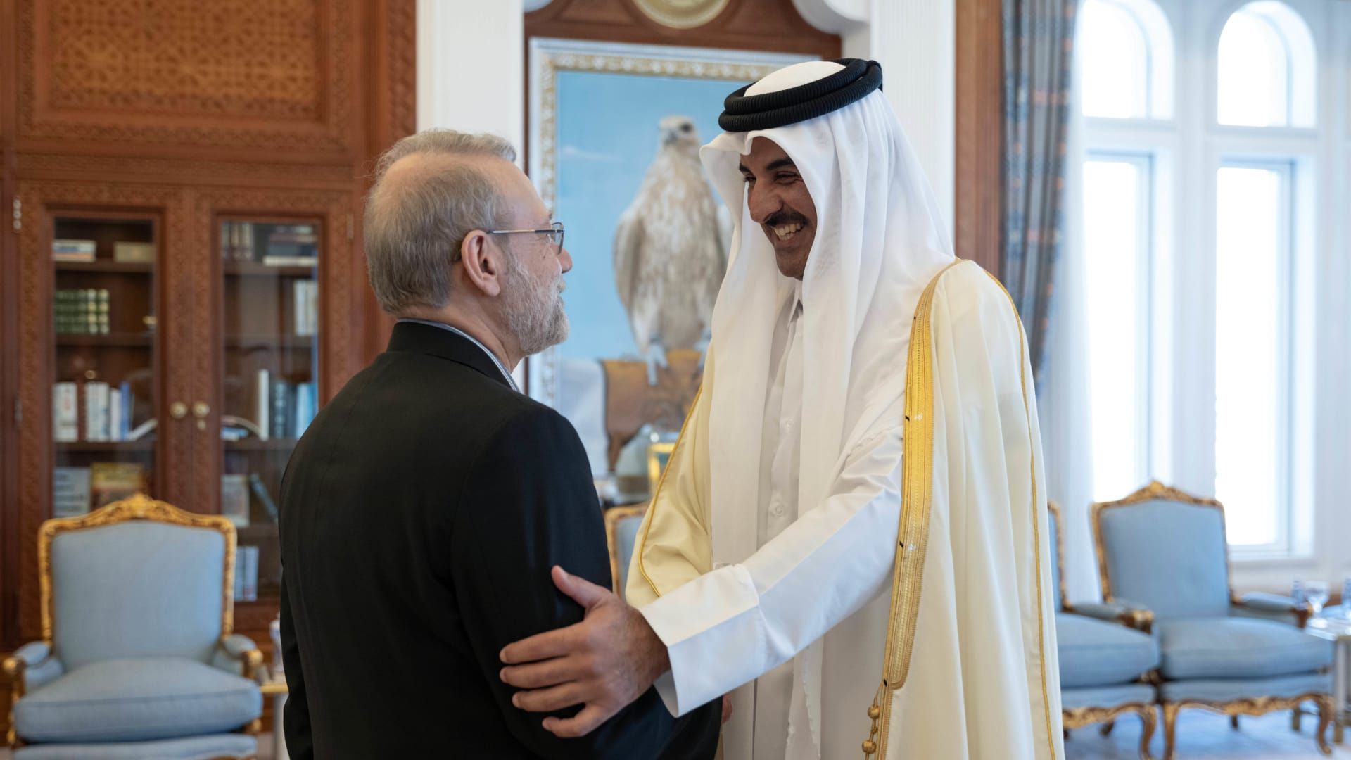 وكان مكتب أمير قطر قال إن الشيخ تميم بن حمد تحدث مع الرئيس الأمريكي دونالد ترامب في مكالمة هاتفية، الأربعاء، وذلك قبل اجتماعه مع لاريجاني.