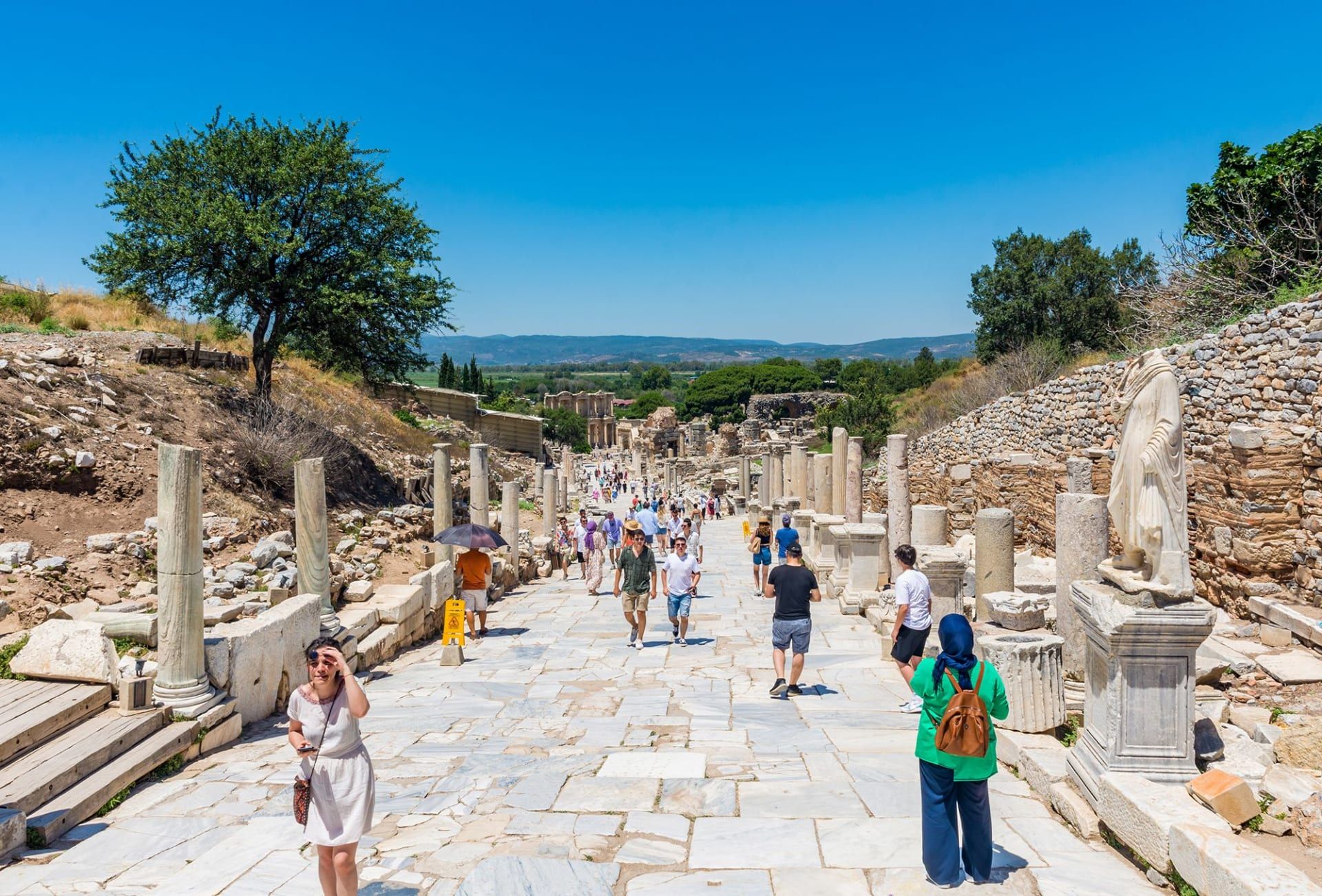 في أسفل التل يقف أبرز معالم المدينة وأكثرها شهرة، أي مكتبة سيلسوس. هذا الصرح الروماني الذي يبلغ ارتفاعه 17 مترًا نجا منه واجهته فقط. وتكشف النوافذ الفارغة على مربعات زرقة السماء، بينما تخلق الأعمدة الرخامية المدببة خداعًا بصريًا يجعل المبنى المؤلف من طبقتين يبدو أكثر فخامة.