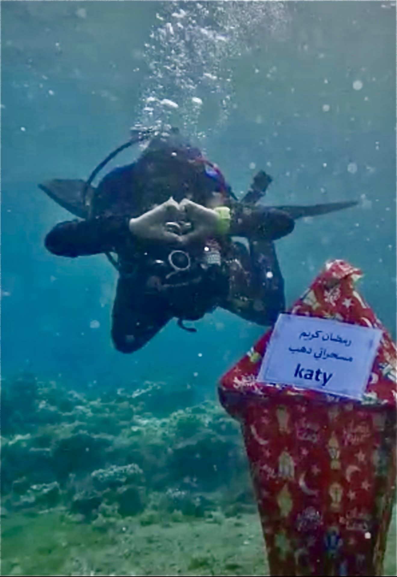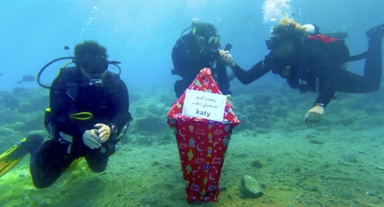 هذا العام، خطرت على بال ظريف وهي مقيمة في مدينة دهب بجنوب سيناء في مصر مبادرة إرسال التهنئة من قاع البحر الأحمر، وهكذا قررت الغوص وهي تحمل فانوسا كبيرا غُطي بزينة رمضان، مع لافتة كُتب عليها "رمضان كريم .. مسحراتي دهب".