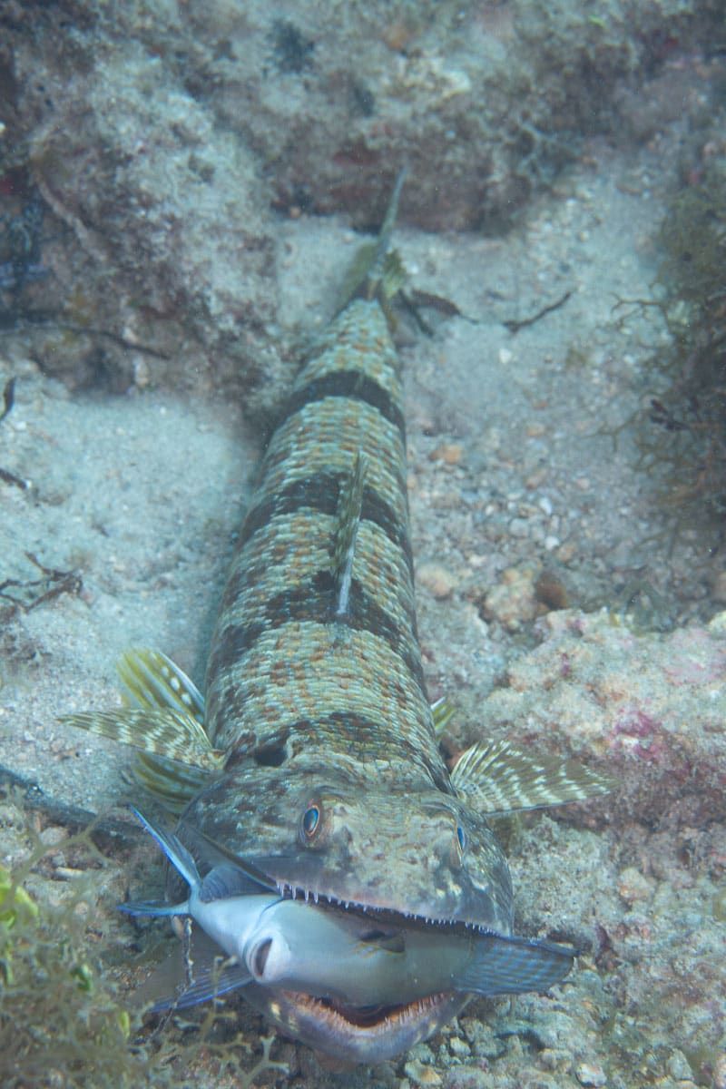 كانت سمكة السحلية تواجه وقتًا عصيبًا لاصطياد وجبتها، إذ قال المصور الأمريكي في مقابلةٍ مع موقع CNN بالعربية: "تمتلك سمكة الجَرّاح أشواكًا دفاعية في زعانفها تمكَّنت من فردها في الوقت المناسب، ومنعها ذلك من أن تتعرض للابتلاع بالكامل".