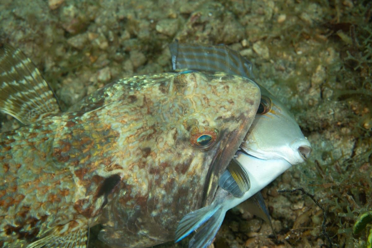 تُظهر الصورة، التي وثّقها جينسن في ولاية فلوريدا الأمريكية عام 2023، سمكة جَرّاح تبدو هادئة بشكلٍ مضحك رُغم تواجدها بين فكّي سمكة سحلية كانت تحاول التهامها.