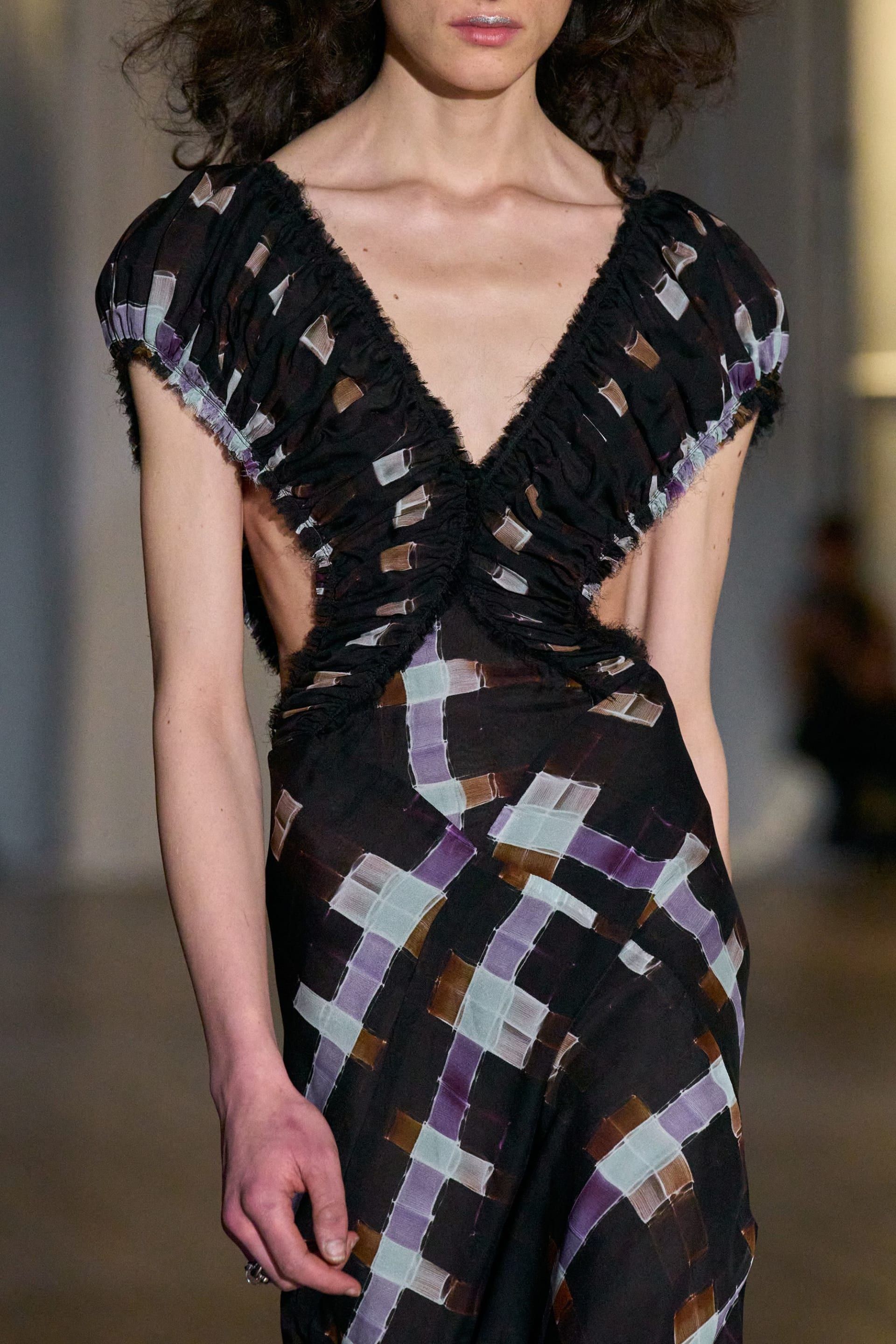 في المقابل، استوحت ريتشل سكوت من أعمال الرسّام الأفرو-كوبي "ويفريدو لام"، مستعرضة تأثيره في استكشاف الغرابة الثقافية للثقافة السوداء والدين. استخدمت لوحة ألوانه الغنية: الأحمر القرمزي العميق، الرمادي المبيّض، والأزرق البودري على تنانير مزخرفة وفساتين مبتكرة ومعاطف تذكارية. ولم تكتف بإعادة إنتاج أعماله، بل دمجت الرموز الروحية والفنية في أقمشتها الخاصة مثل الأورغانزا والكروشيه، جامعًة بين الإثارة والرقي من دون إفراط، لتقدّم بيانًا نادرًا في عالم الموضة المهووس بالقطع الاستهلاكية.