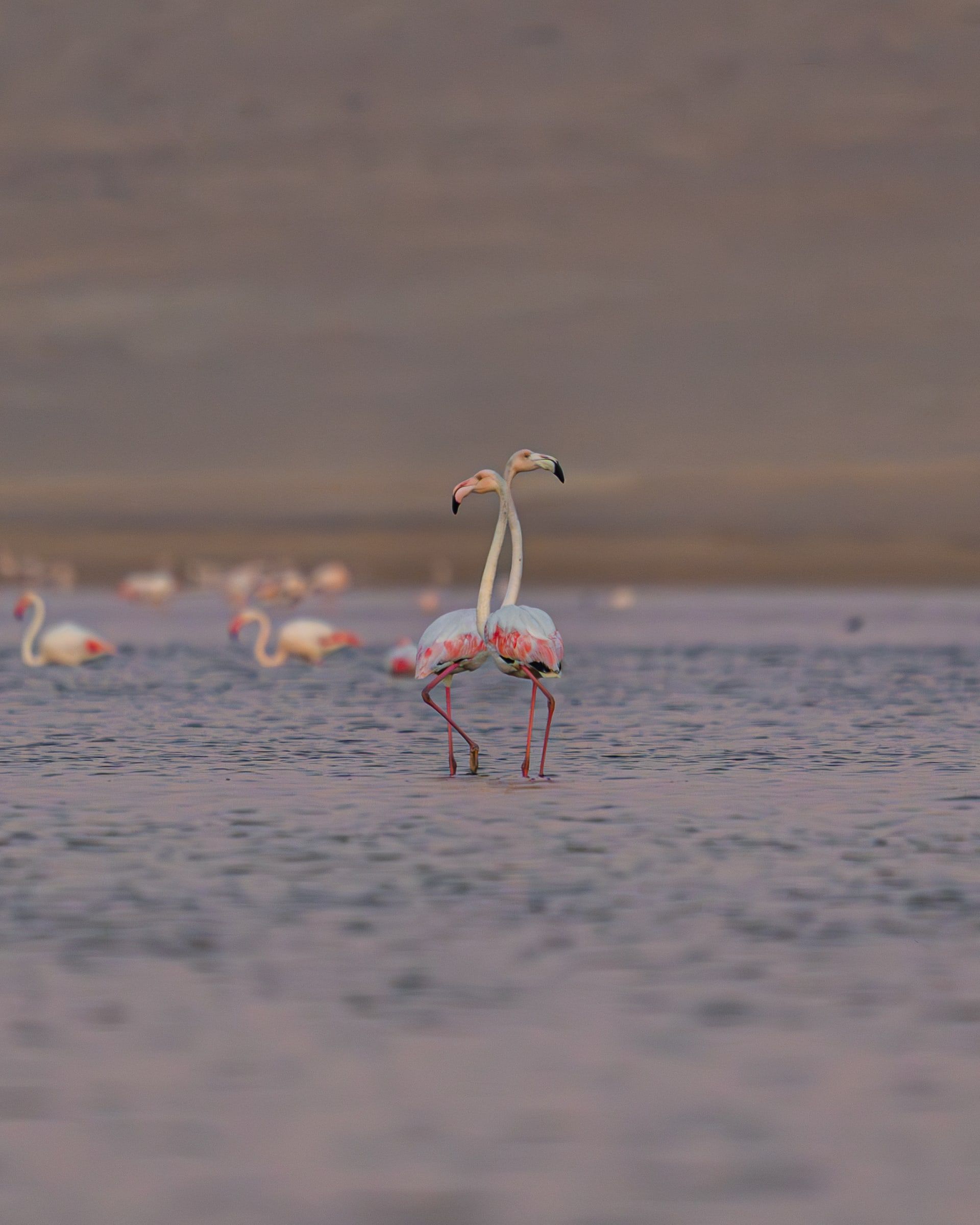 أثناء التوثيق، حرص عماد على إبراز الإيقاع الجماعي لأسراب الطيور إلى جانب التباين اللوني المتمثل باللون الوردي في مواجهة الألوان الترابية للبحيرة.