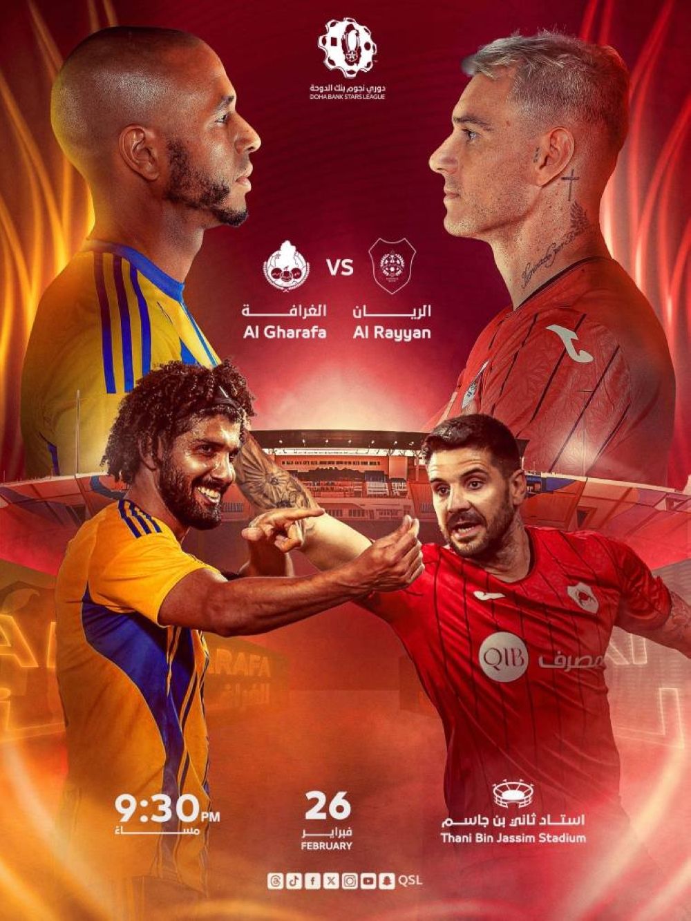 الأربعاء 25 فبراير 2026 05:52 مساءً تتجه الأنظار مساء اليوم إلى استاد ثاني بن جاسم بالغرافة، حيث يستضيف الغرافة نظيره الريان عند الساعة التاسعة والنصف، في مواجهة قوية تفتتح منافسات الجولة السابعة عشرة من دوري نجوم بنك الدوحة للموسم الكروي 2025-2026.