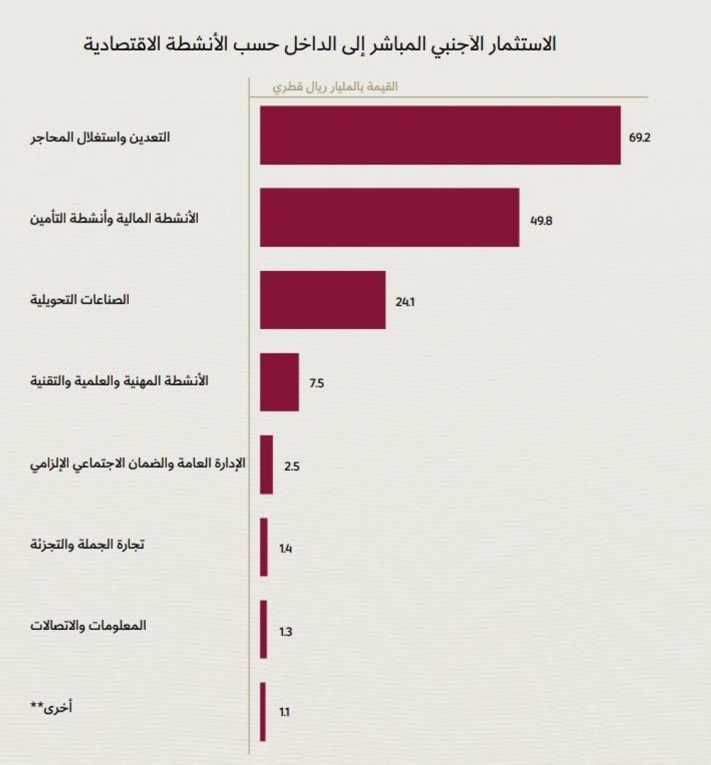 وقال المجلس: «يعكس نمو رصيد الاستثمار الأجنبي المباشر إلى الداخل بنسبة 7 في المائة ثقة المستثمرين الأجانب في متانة الاقتصاد القطري واستقراره، مدعومة بوضوح السياسات الاقتصادية والخطط الوطنية التي أسهمت في تعزيز مكانة دولة قطر كوجهة استثمارية إقليمية ودولية. ويأتي هذا الأداء في إطار دعم أهداف رؤية قطر الوطنية 2030، ولا سيما ما يتعلق بتعزيز التنمية الاقتصادية وتنويع القاعدة الإنتاجية ورفع تنافسية الاقتصاد».