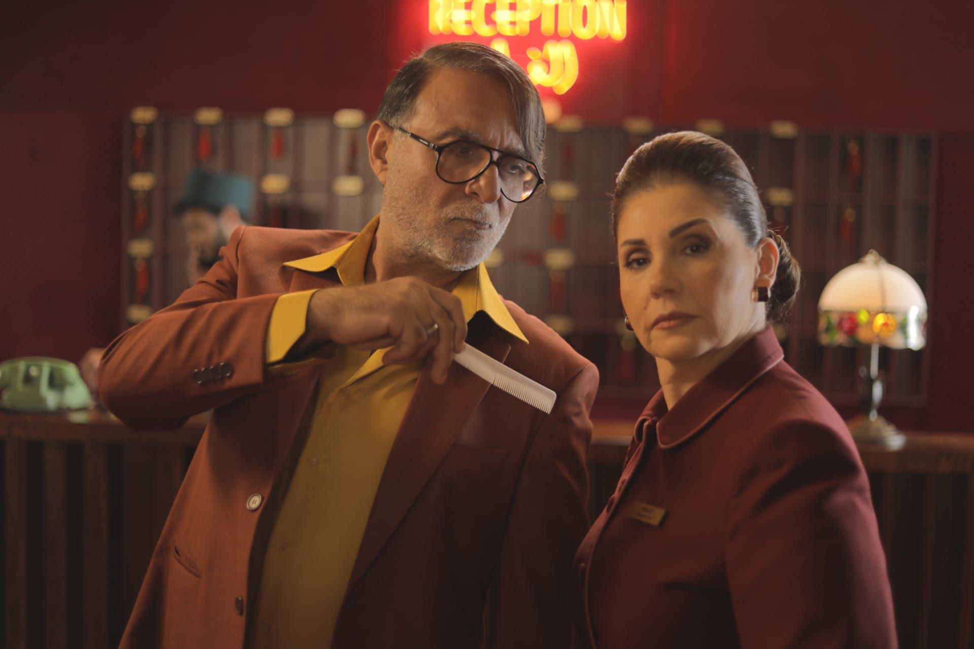توفر نقاط البولكا إيقاعًا بصريًا على الكاميرا، والجلد الملون يضيف قوة، بينما تدعم الألوان الدافئة مثل العنبر، والوردي، والأخضر الغامق الرحلة العاطفية للشخصيات، بما يتماشى مع جو الفندق الدافئ والمليء بالحنين.
