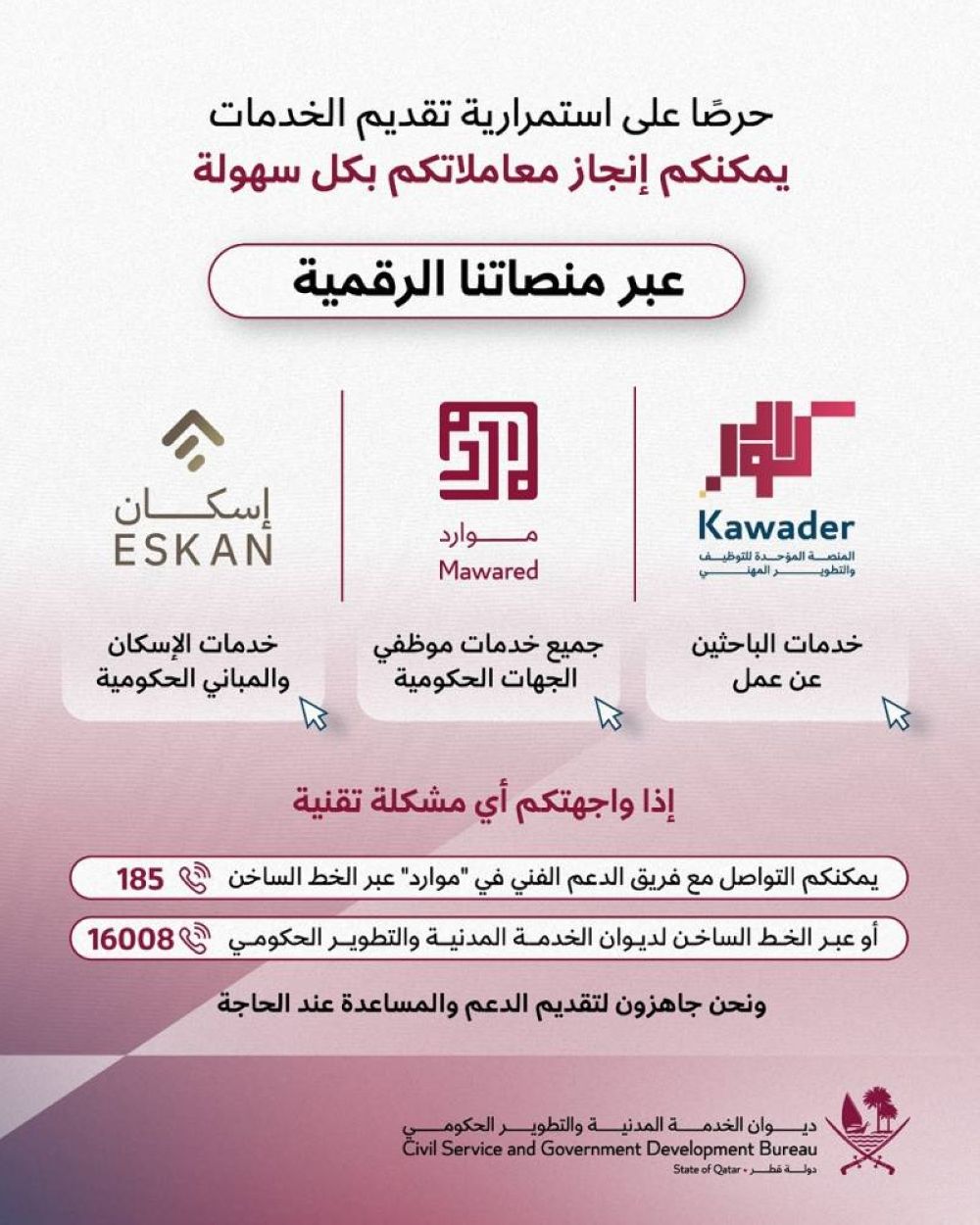 وأوضح الديوان أن منصاته الرقمية تتيح للموظفين والباحثين عن عمل والجهات الحكومية الاستفادة من مجموعة متكاملة من الخدمات الإلكترونية التي تمكنهم من إنجاز معاملاتهم ومتابعة طلباتهم عن بُعد، في إطار الجهود الرامية إلى تعزيز التحول الرقمي وتطوير منظومة العمل الحكومي، وتشمل هذه المنصات المنصة الموحدة للتوظيف والتطوير المهني كوادر، التي توفر خدمات متكاملة للباحثين عن عمل، وتتيح لهم إنشاء ملفاتهم المهنية والتقدم للفرص الوظيفية المتاحة في الجهات الحكومية، إلى جانب الاستفادة من برامج التطوير والتأهيل المهني، كما يتضمن النظام الإلكتروني موارد المخصّص لتقديم خدمات الموارد البشرية لموظفي الجهات الحكومية، حيث يتيح عدداً من الخدمات الإدارية المرتبطة بشؤون الموظفين وإدارة بياناتهم الوظيفية.