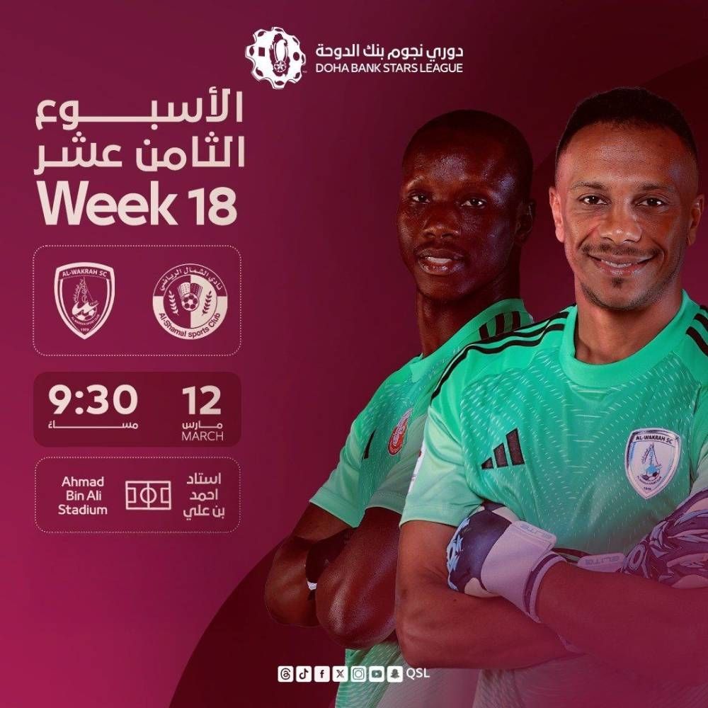 الأربعاء 11 مارس 2026 07:40 مساءً يلتقي فريقا الوكرة والشمال في مواجهة قوية ضمن منافسات الجولة الثامنة عشرة من دوري نجوم بنك الدوحة للموسم الكروي 2025-2026، وذلك في تمام الساعة التاسعة والنصف مساءً على ستاد أحمد بن علي بأم الأفاعي يوم الخميس 12 مارس الجاري.