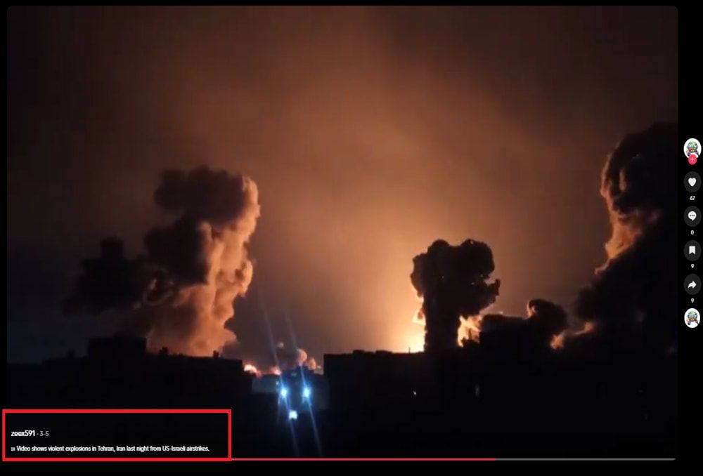 شُوهد الفيديو عشرات الآلاف من المرات في منصة إكس، مصحوبًا بوصف مُضلل يقول: "عاجل طهران تحترق قصف منظم ودقيق علي الحرس الثوري الإرهابي وكل مؤسسات النظام في المدينة".