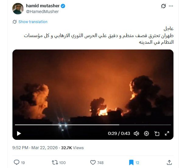 اخبار العرب -كندا 24: الاثنين 23 مارس 2026 04:27 مساءً دبي، الإمارات العربية المتحدة (CNN)-- تداولت حسابات مقطع فيديو في وسائل التواصل الاجتماعي، باعتباره لقصف حديث تعرضت له مواقع للحرس الثوري الإيراني في العاصمة طهران.